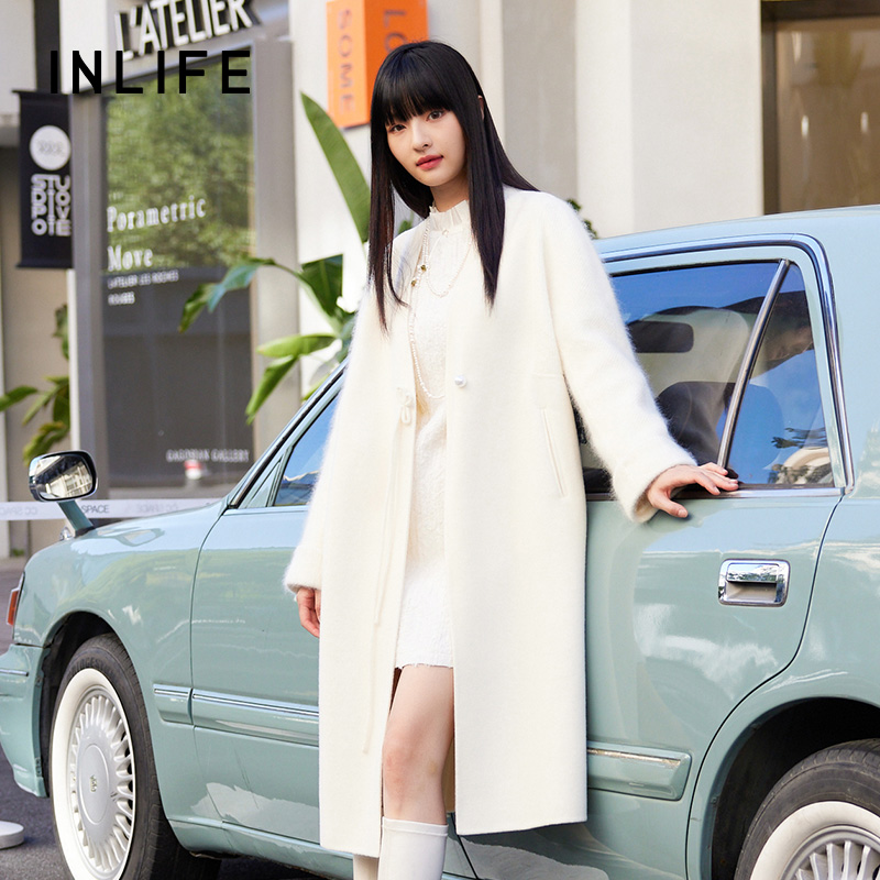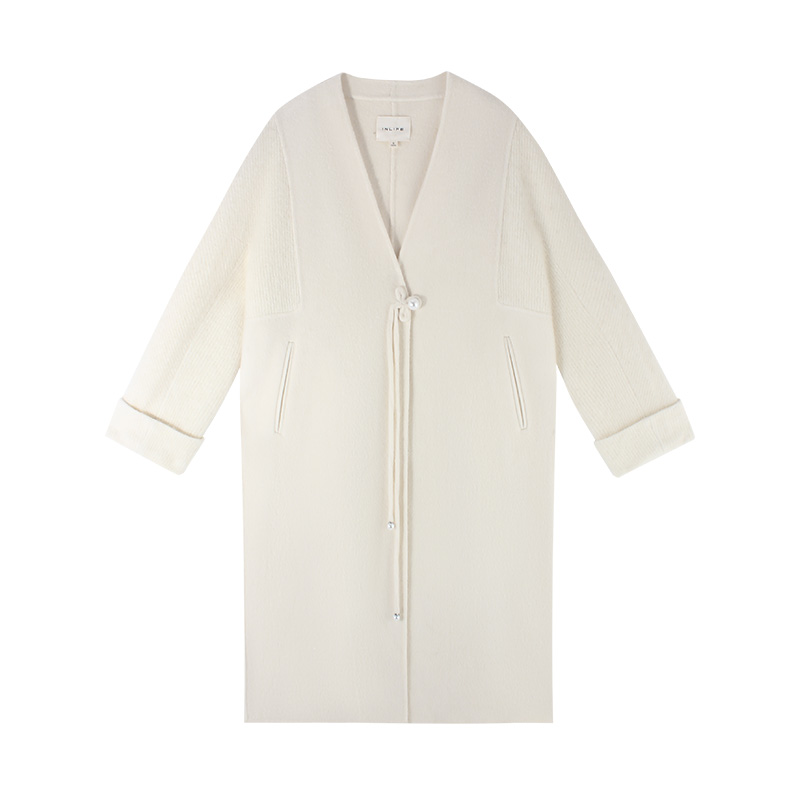 伊纳芙高级v领长款双面羊毛大衣女冬季新款宽松洋气保暖毛呢外套