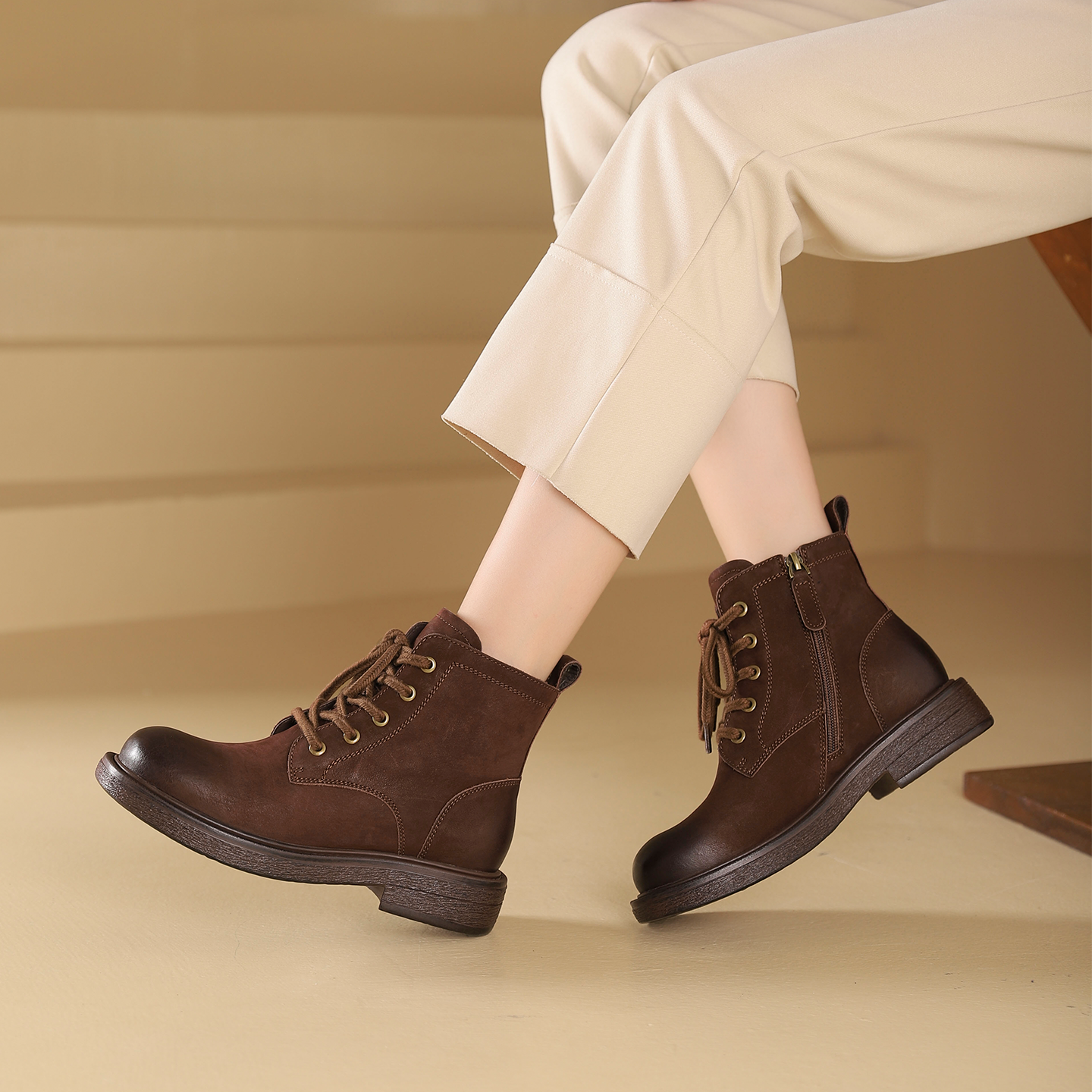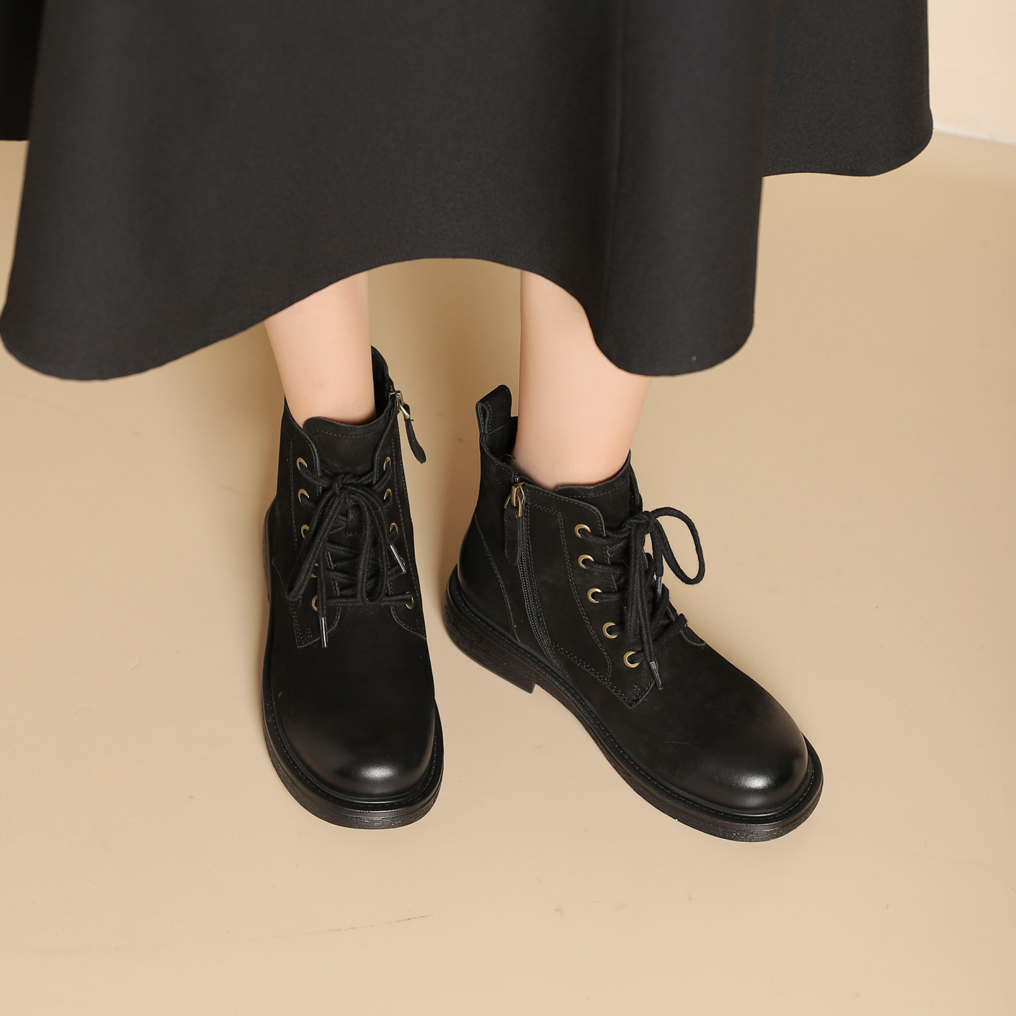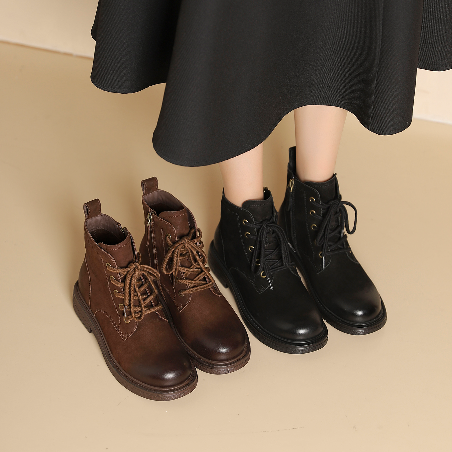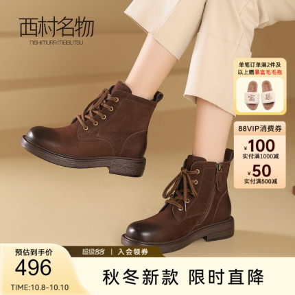 西村名物2025秋冬新款真皮复古英伦风圆头厚底增高百搭女马丁靴
