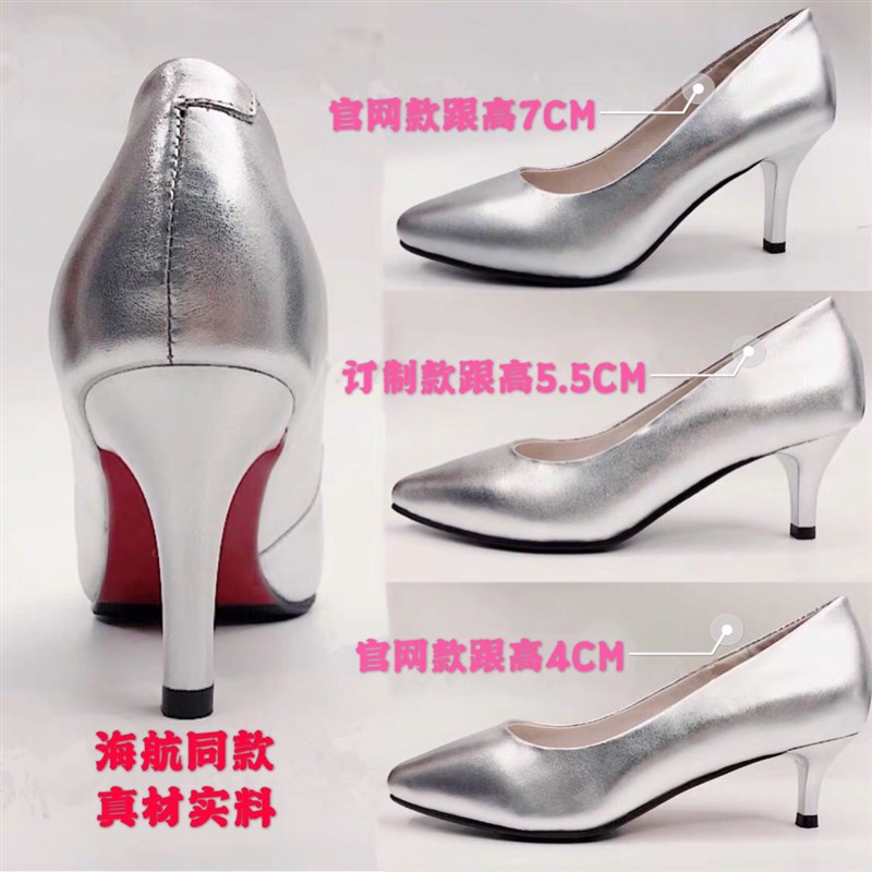 海航制服空姐鞋尖头银色高跟细跟空乘工作单鞋平底鞋伴娘婚鞋女