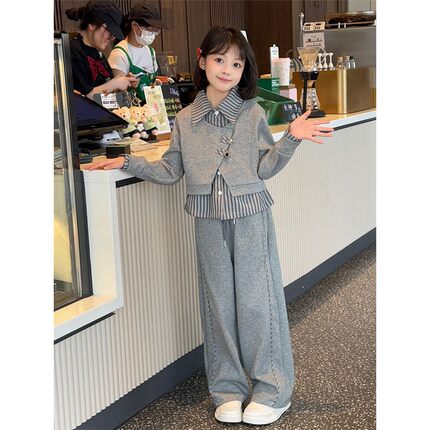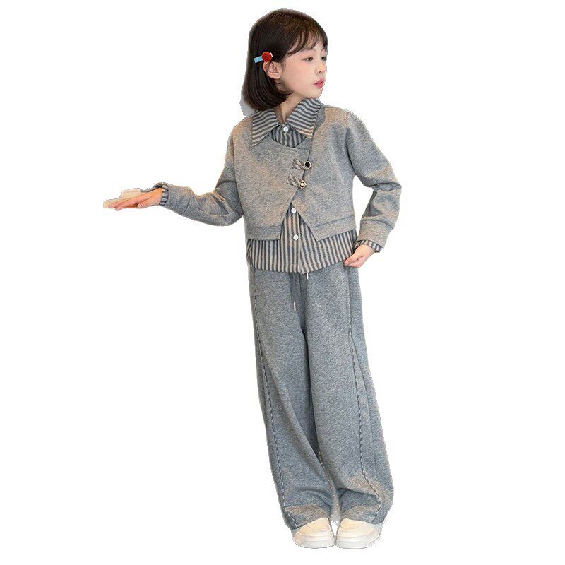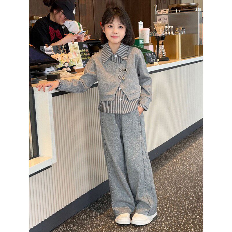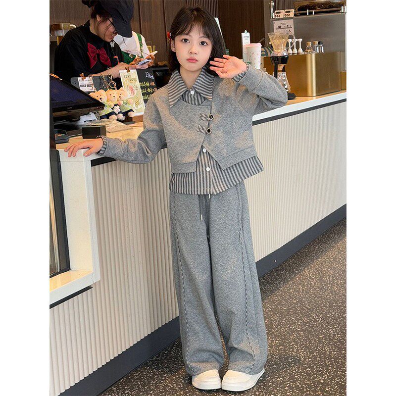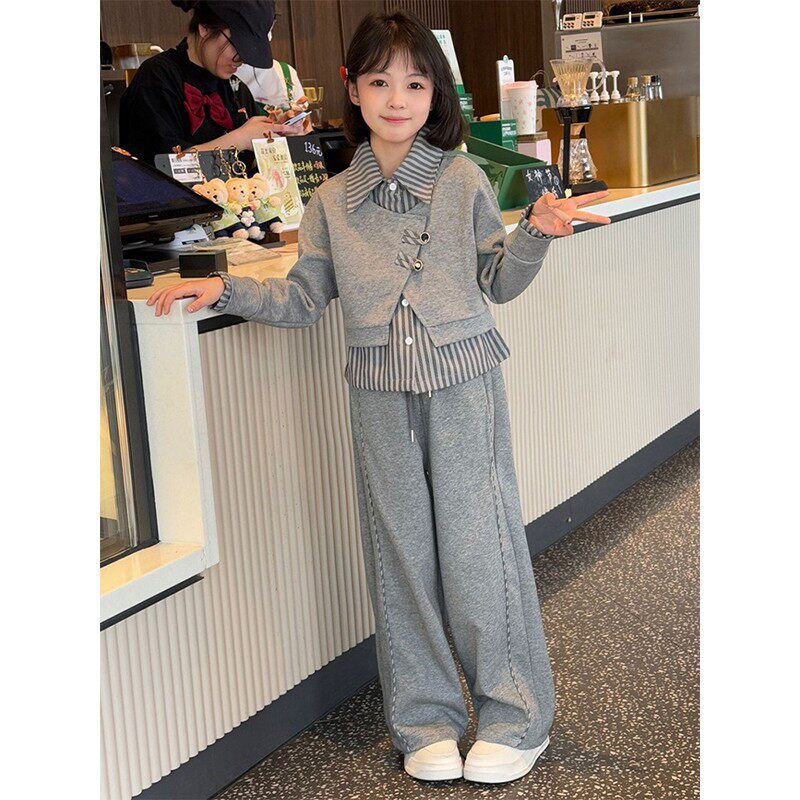 童装女童套装秋装中大童长袖假两件衬衫卫衣阔腿裤学生时尚