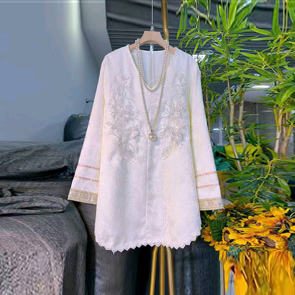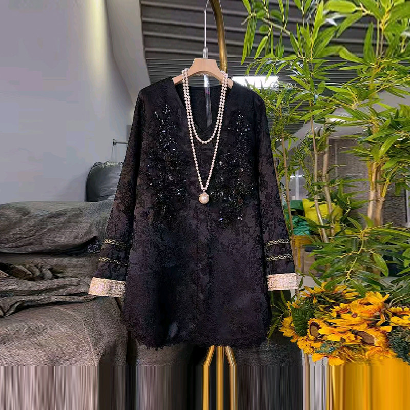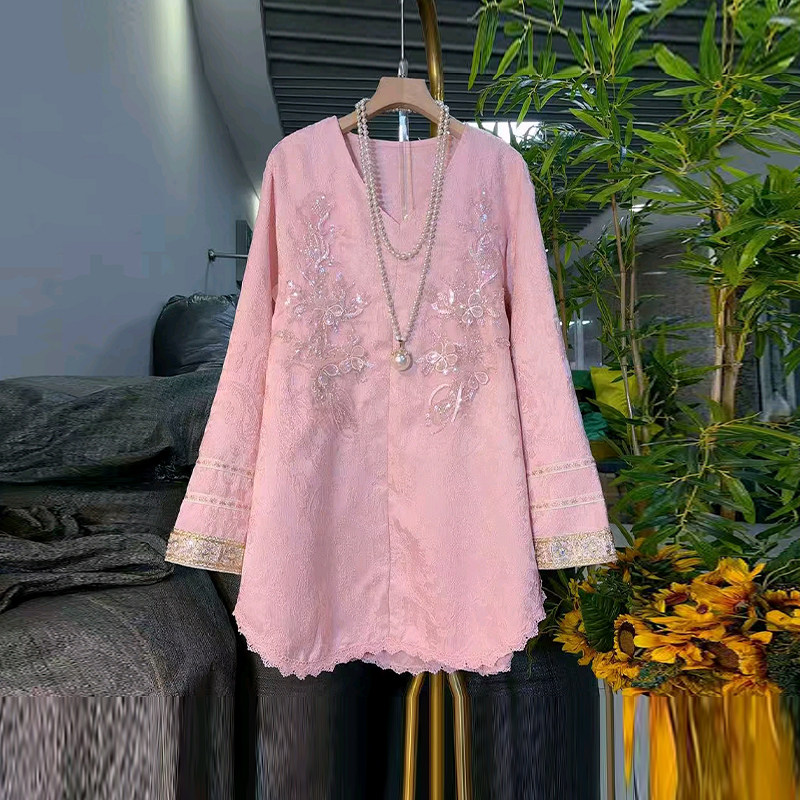 胖妹妹拼色袖口亮钻花长袖小衫法式气质小众设计大码女装百搭上衣