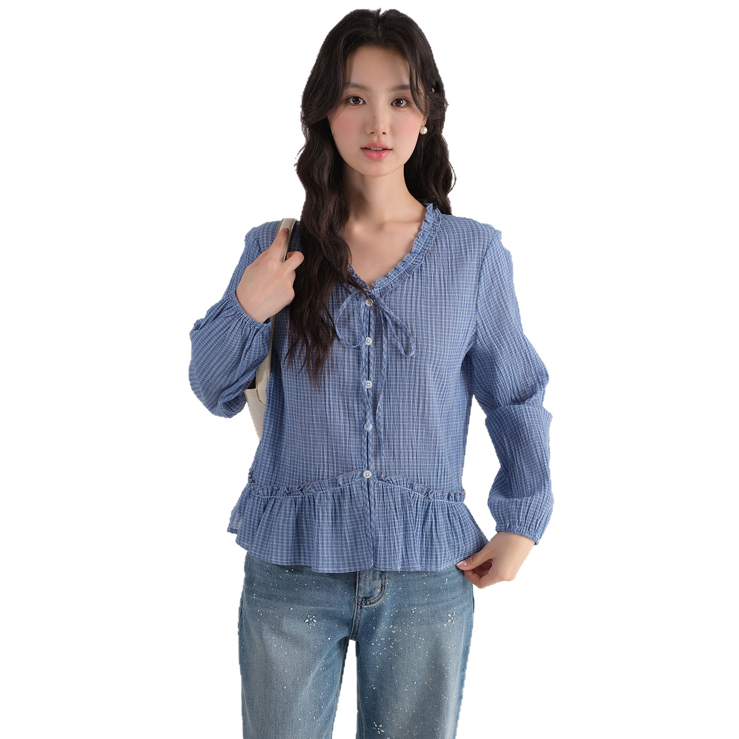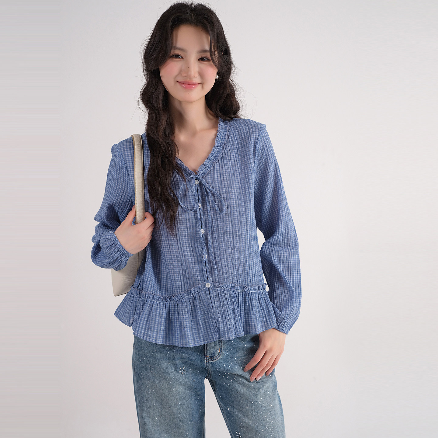 蓝若水大码女装2026春装新款木耳边V领全棉衬衫胖MM复古格纹上衣