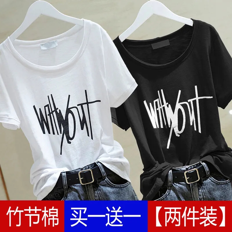 单/两件 竹节棉t恤女印花短袖夏季新款宽松女装内搭ins潮韩版百搭