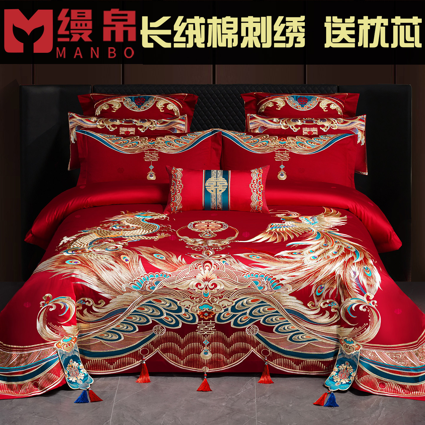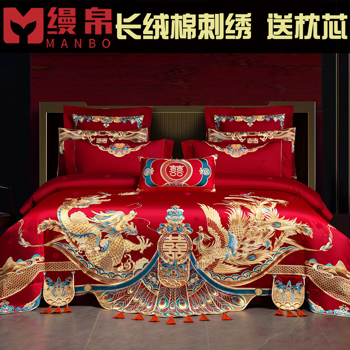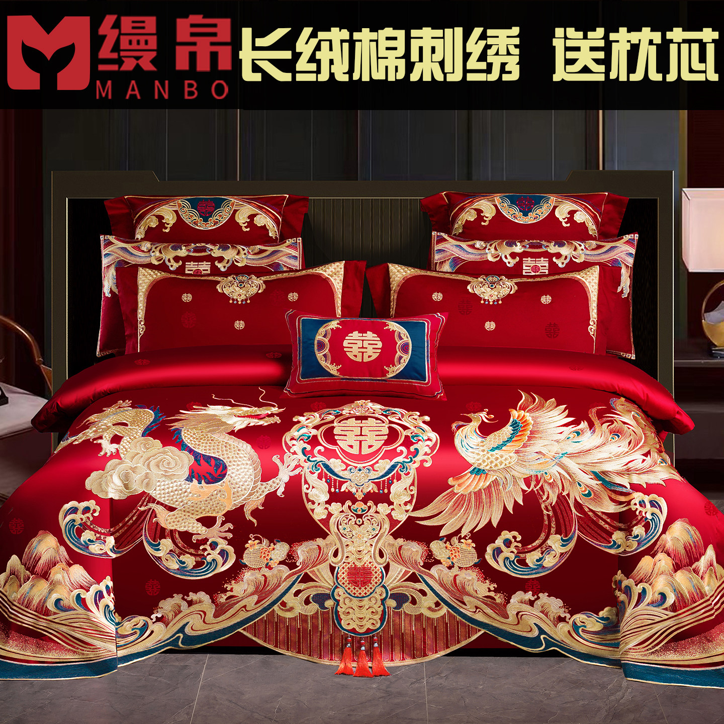 120支新疆长绒棉婚庆四件套大红色龙凤纯棉刺绣全棉结婚床上用品4