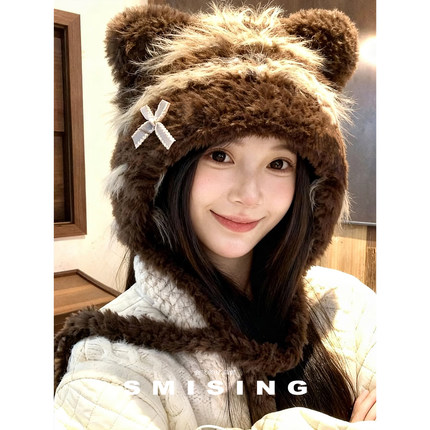 可爱小熊毛绒帽女秋冬保暖防寒护颈蝴蝶结雷锋帽显脸小户外护耳帽