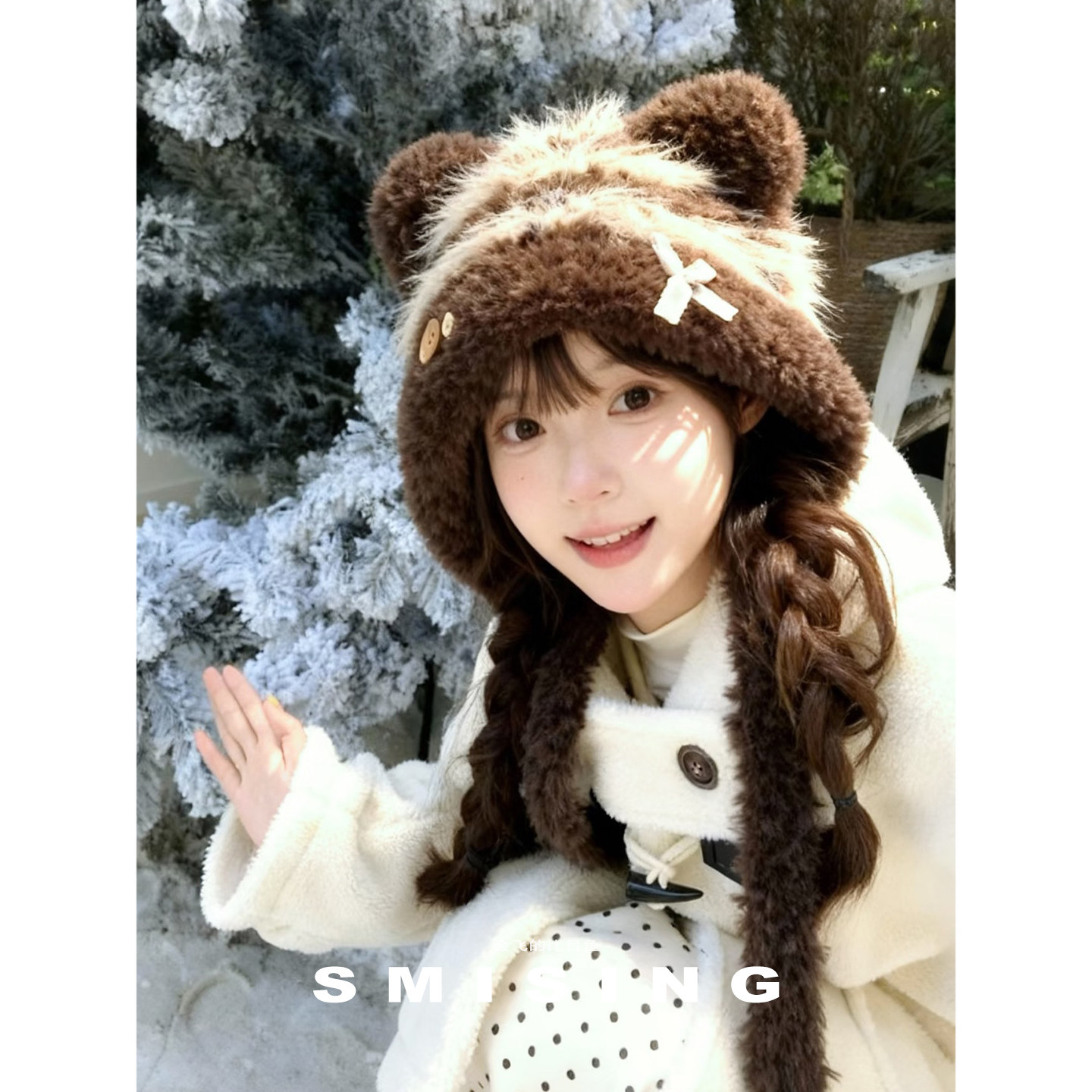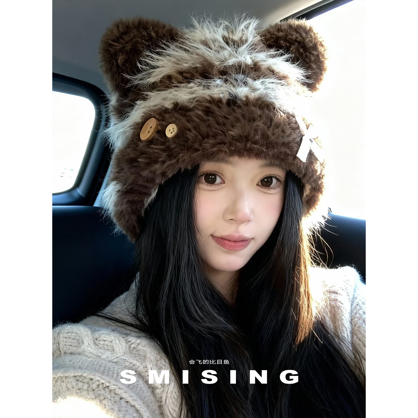 可爱小熊毛绒帽女秋冬户外