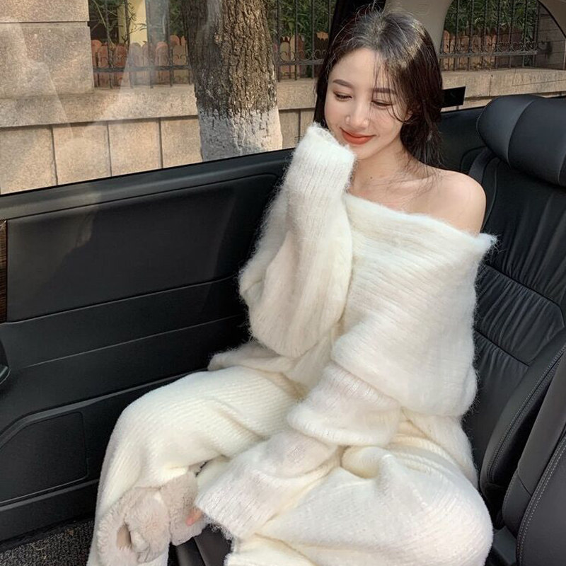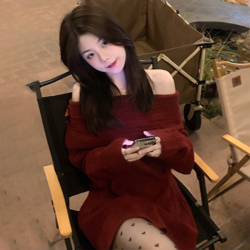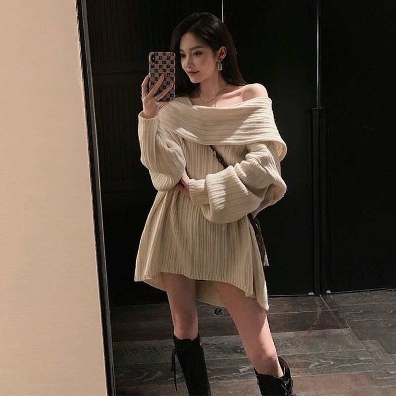 翻领一字肩毛衣女露肩性感简约秋冬宽松中长款慵懒风设计感针织衫