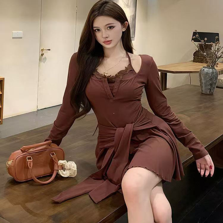 法式辣妹假两件蕾丝吊带连衣裙女秋季新款气质收腰显瘦设计短裙子