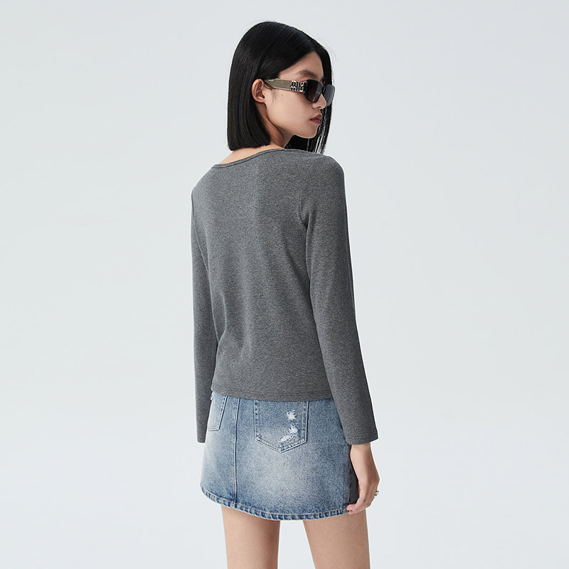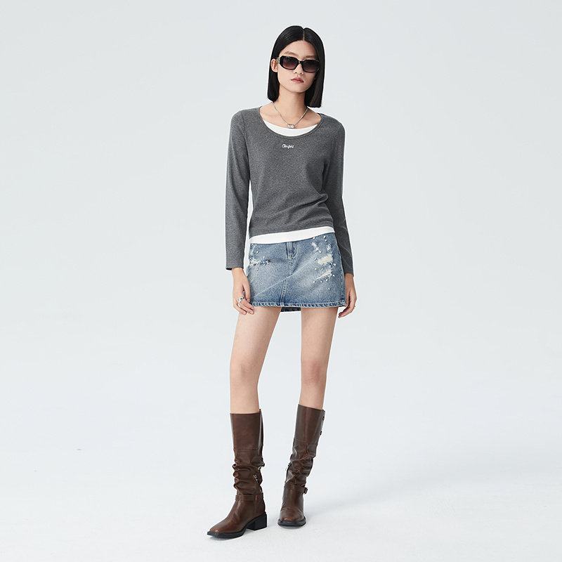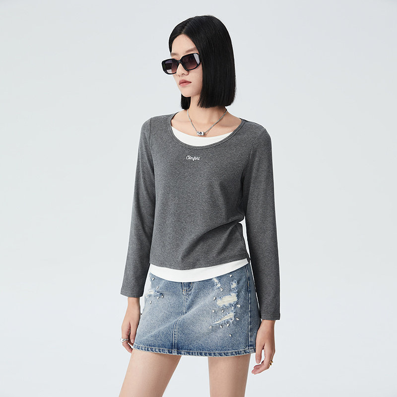 普普风2025年新款商场同款假两件撞色拼接重工刺绣百搭登山T恤女