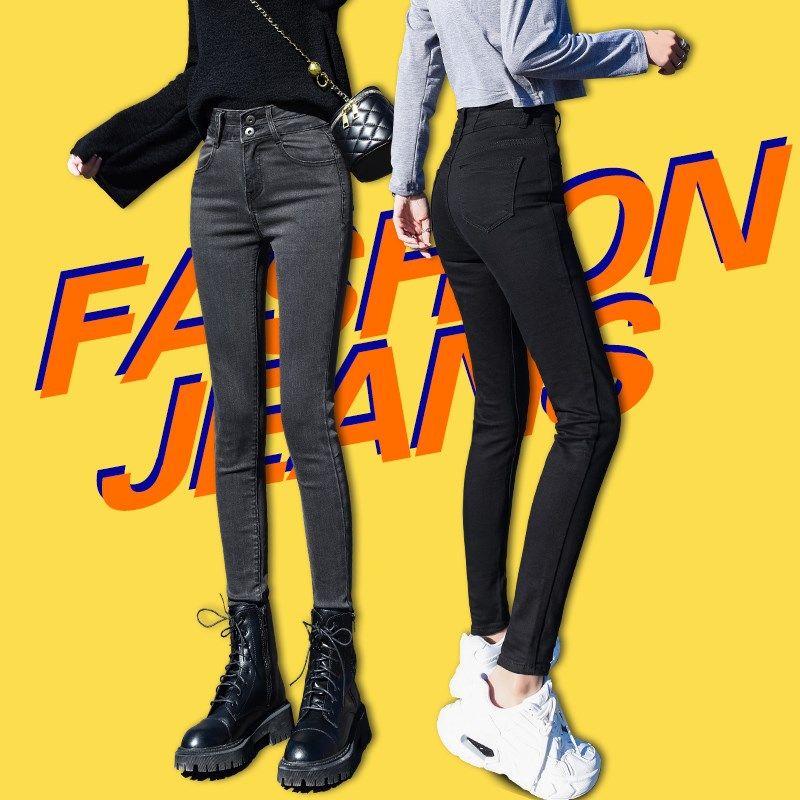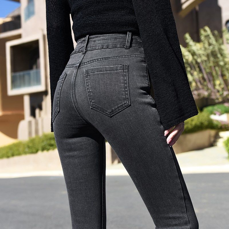 烟灰色牛仔裤女2025春秋新款高腰弹力显瘦百搭紧身小脚九分长裤子