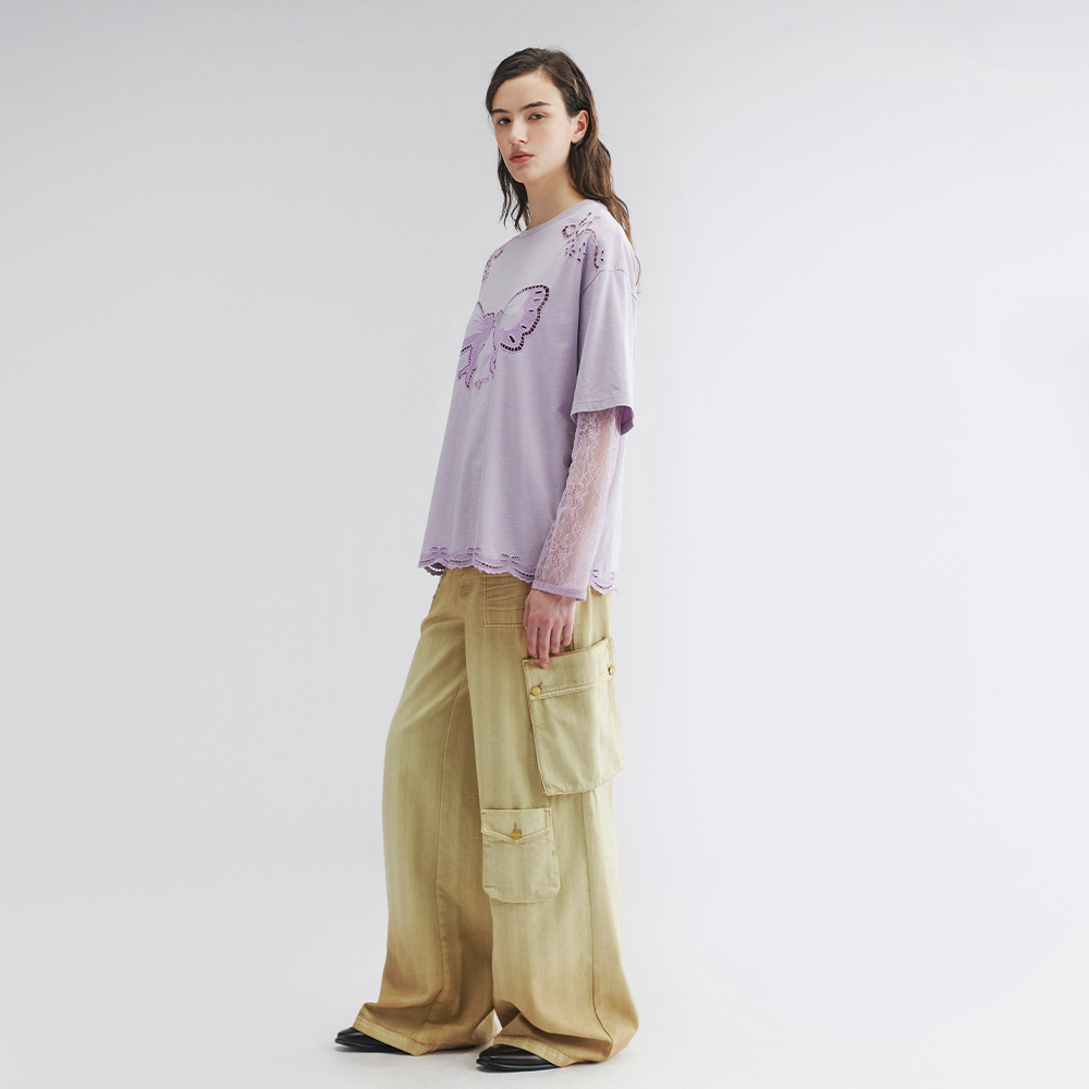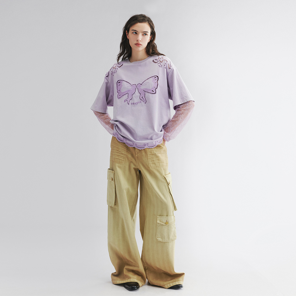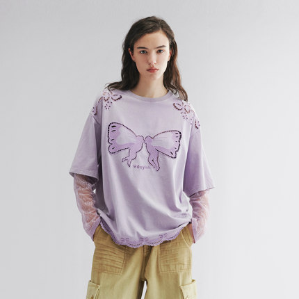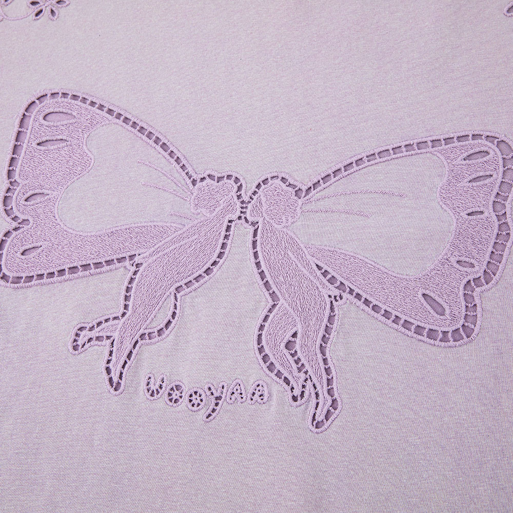UOOYAA/乌丫2025秋季新款「爱与天使」镂空绣花假两件T恤