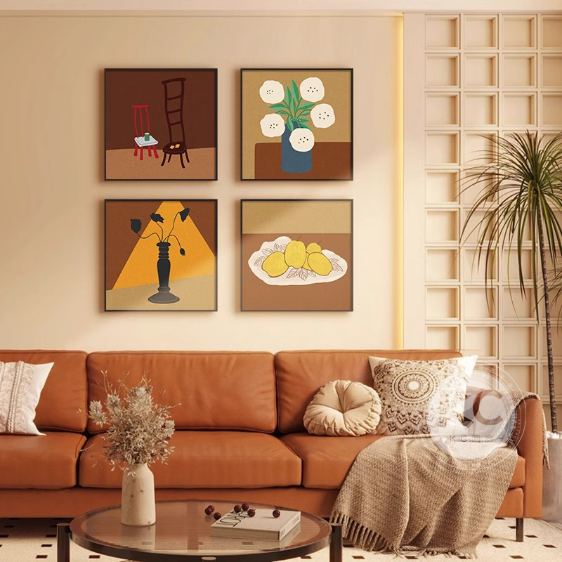 中古风客厅沙发背景墙挂画美拉德卡通餐厅挂画高级餐边柜组合壁画