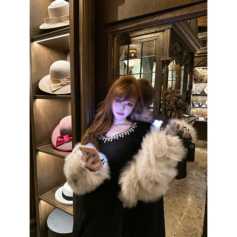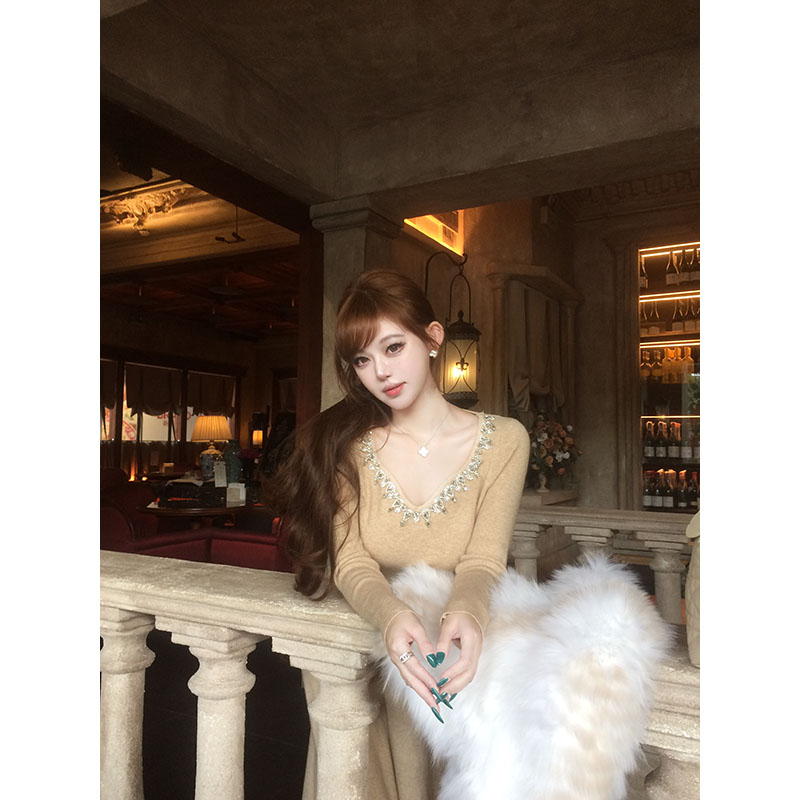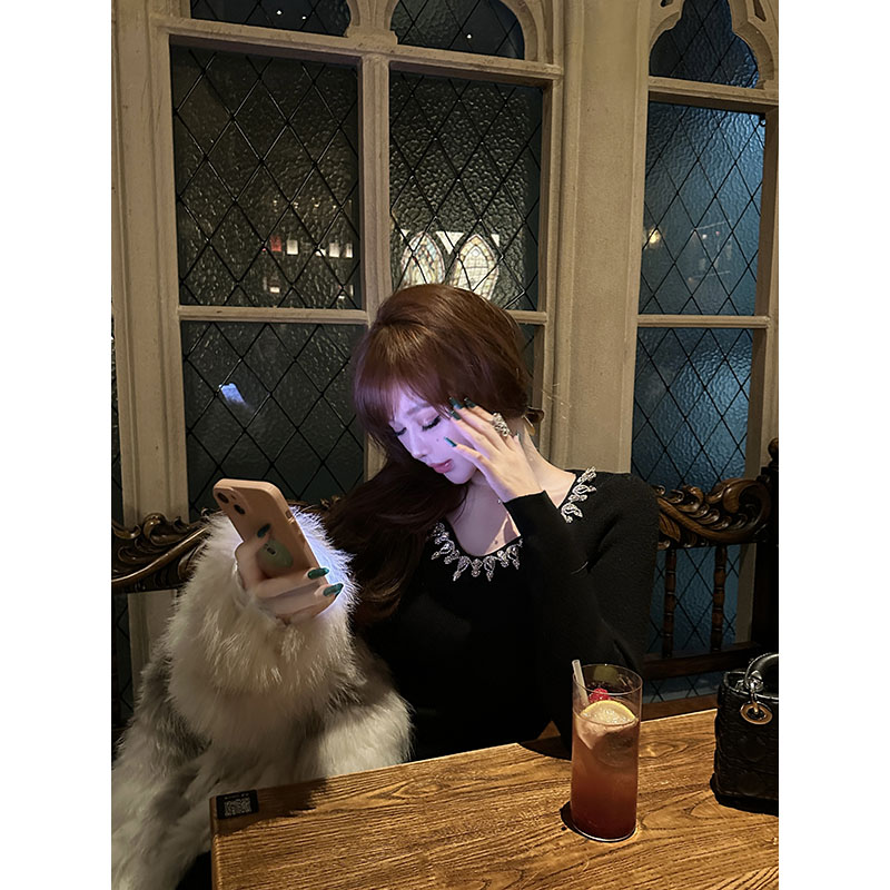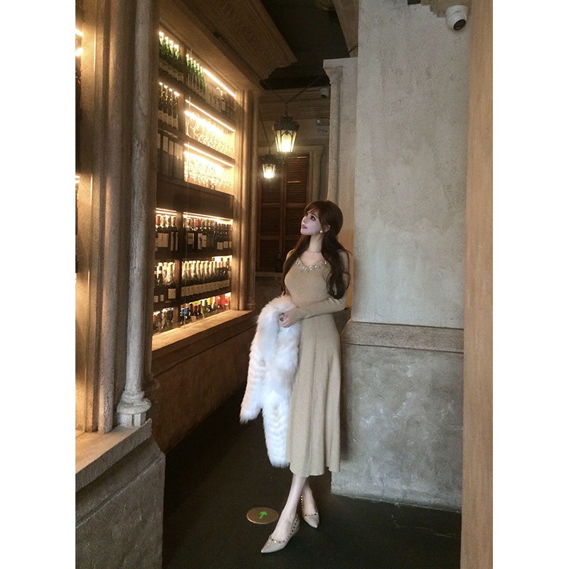 With 99jiu【香槟绮梦】 针织连衣裙女高级镶钻显瘦内搭打底裙冬