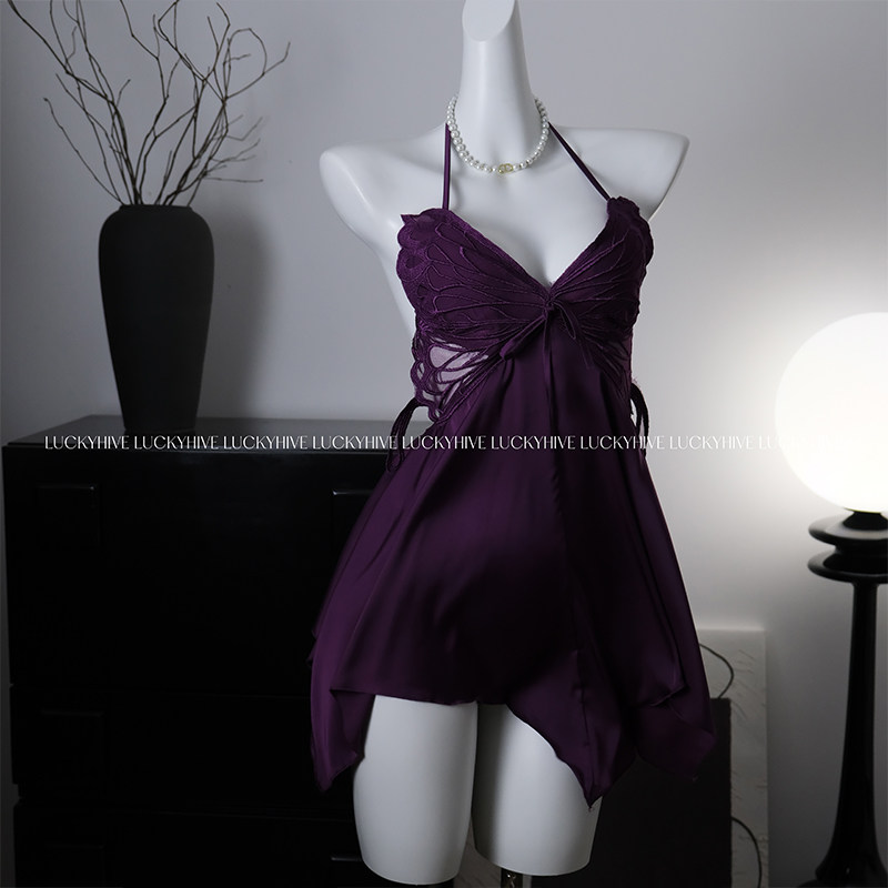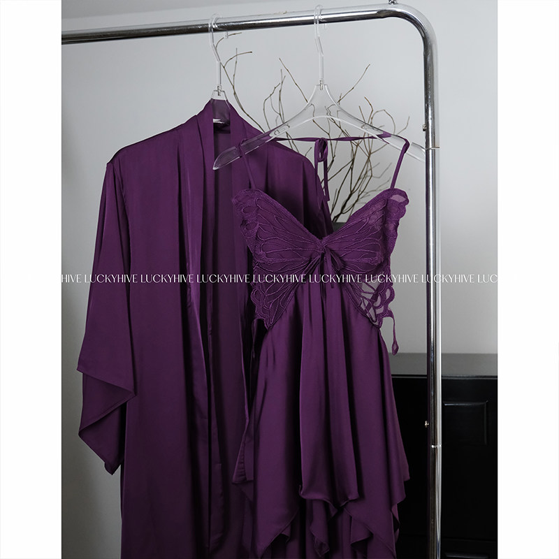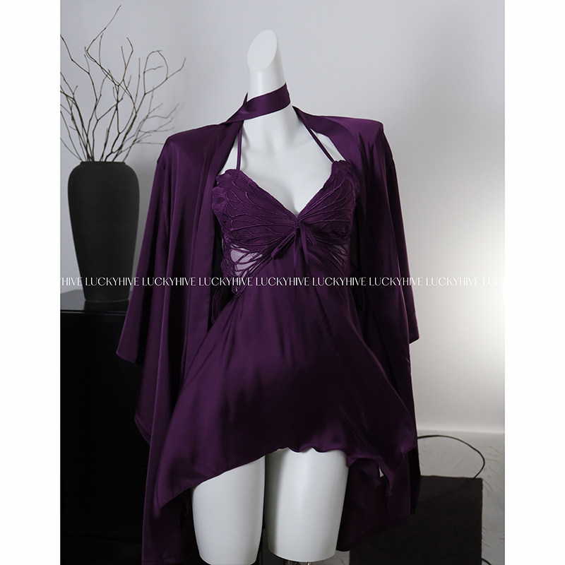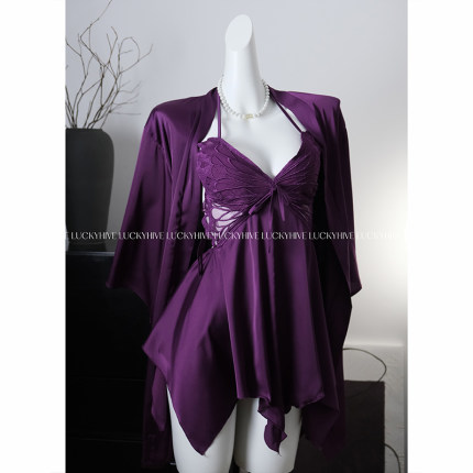 LuckyHive 紫色诱惑·性感睡衣女纯欲风蕾丝挂脖吊带睡裙外袍套装