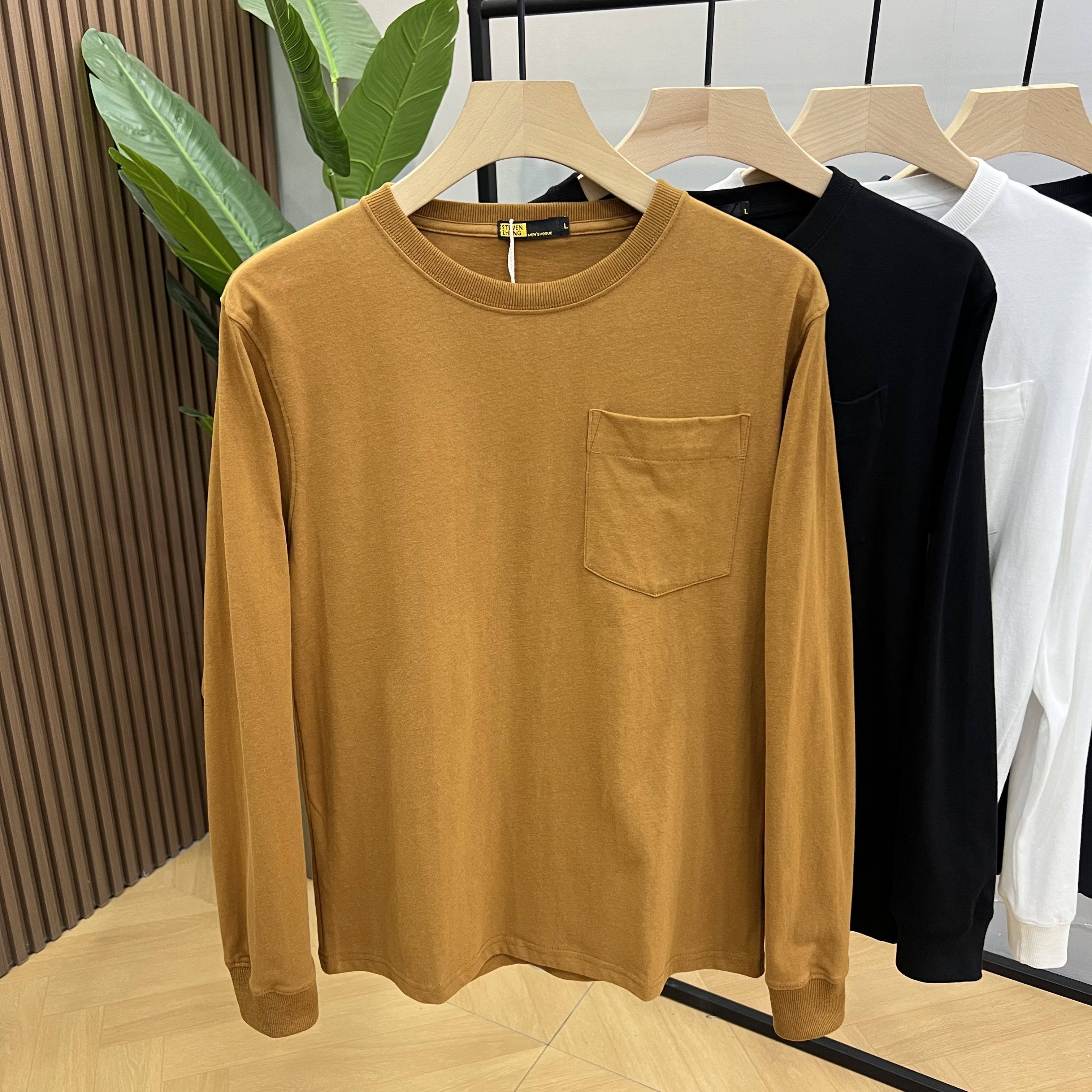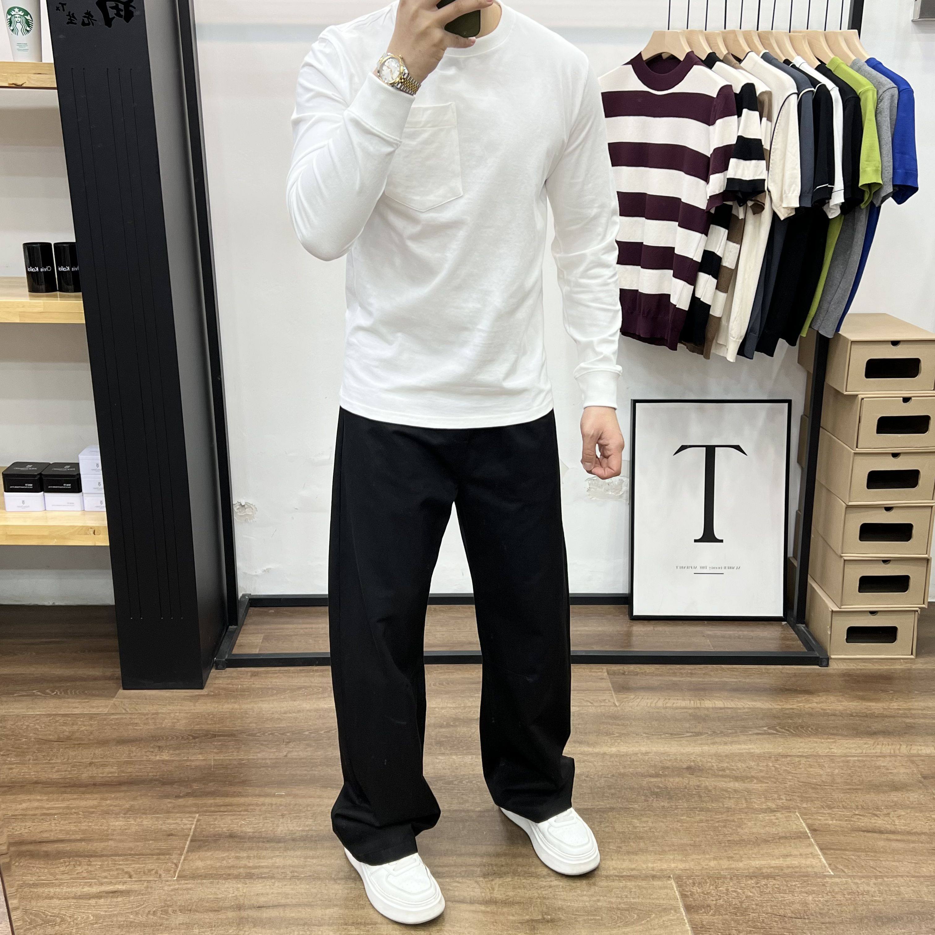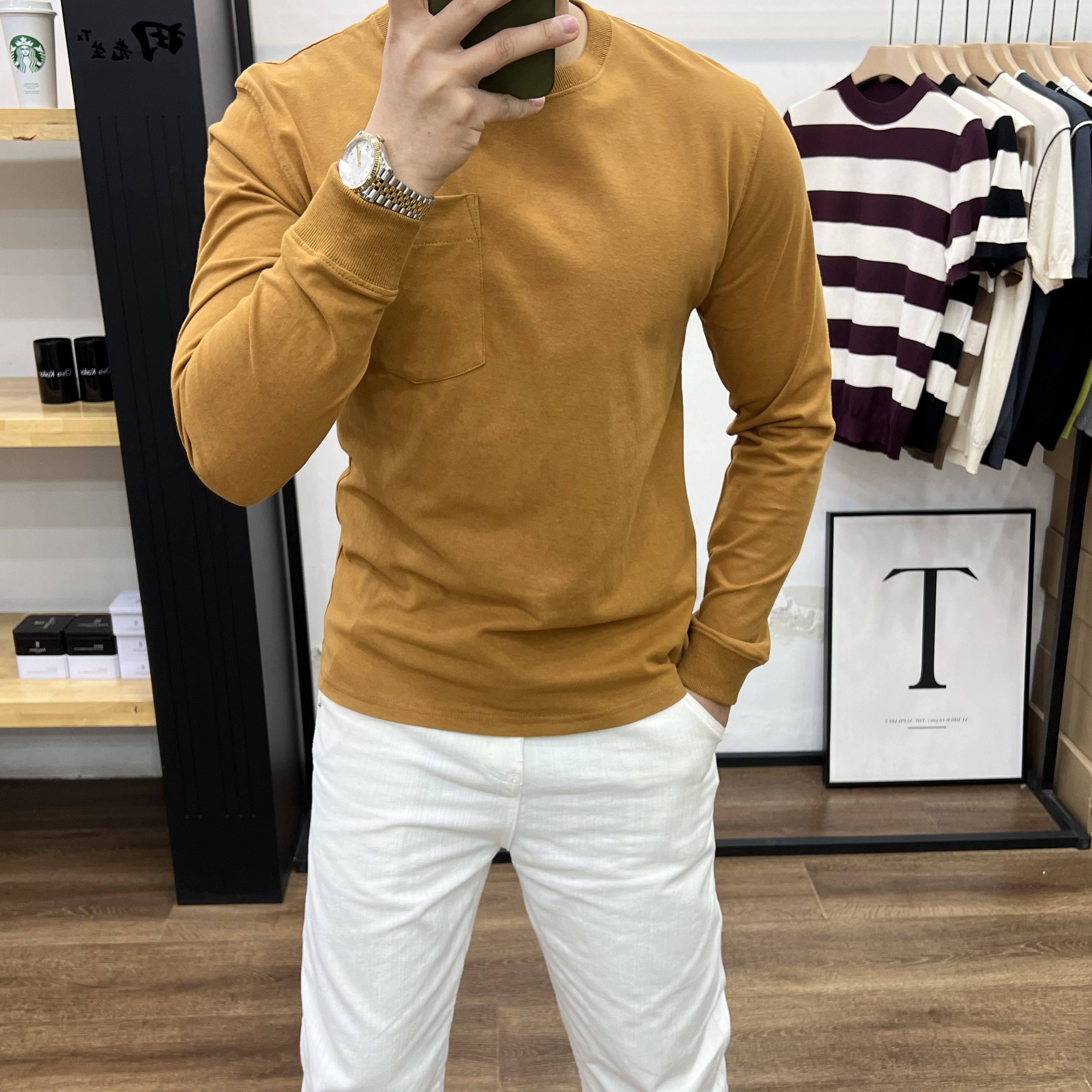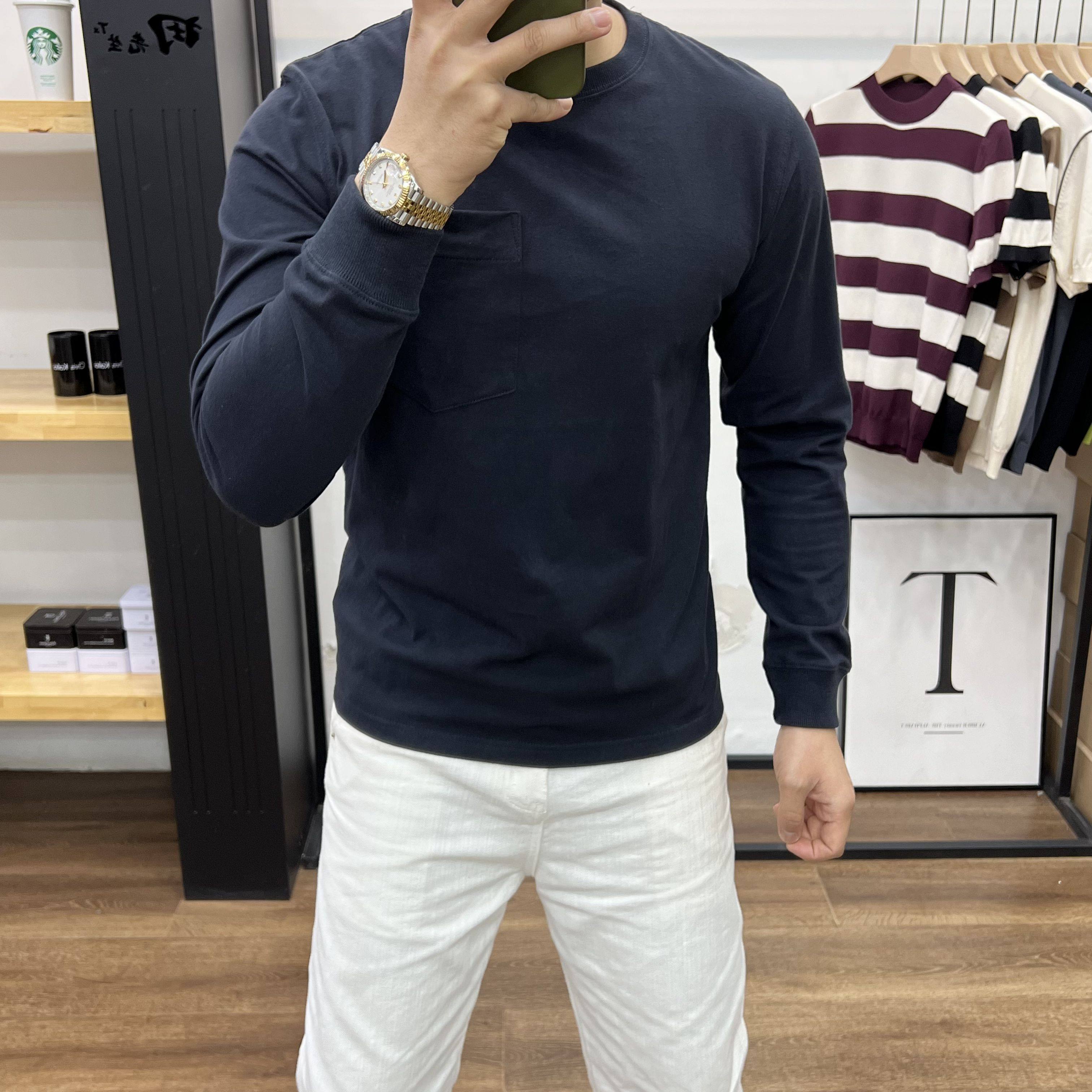 春夏季男士时尚简约休闲口袋圆领长袖t恤韩版修身打底衫纯色上衣T