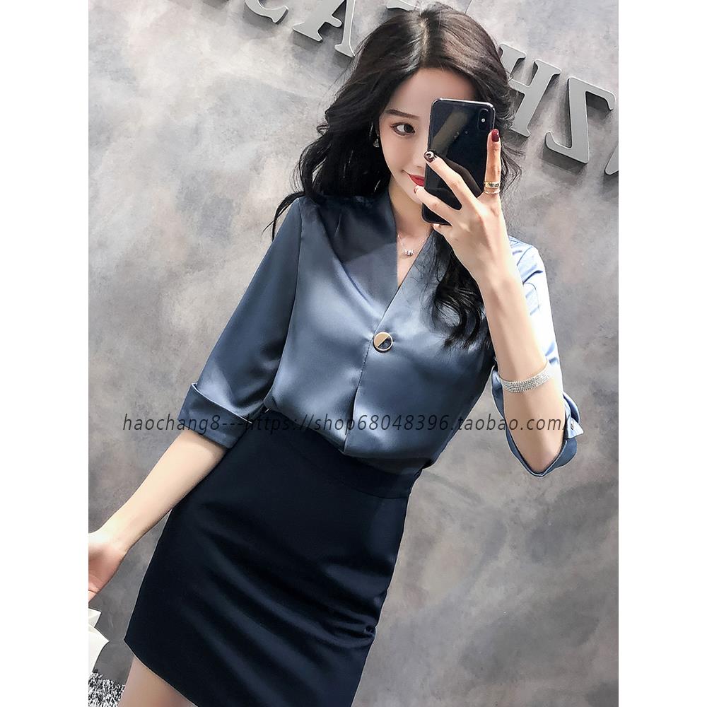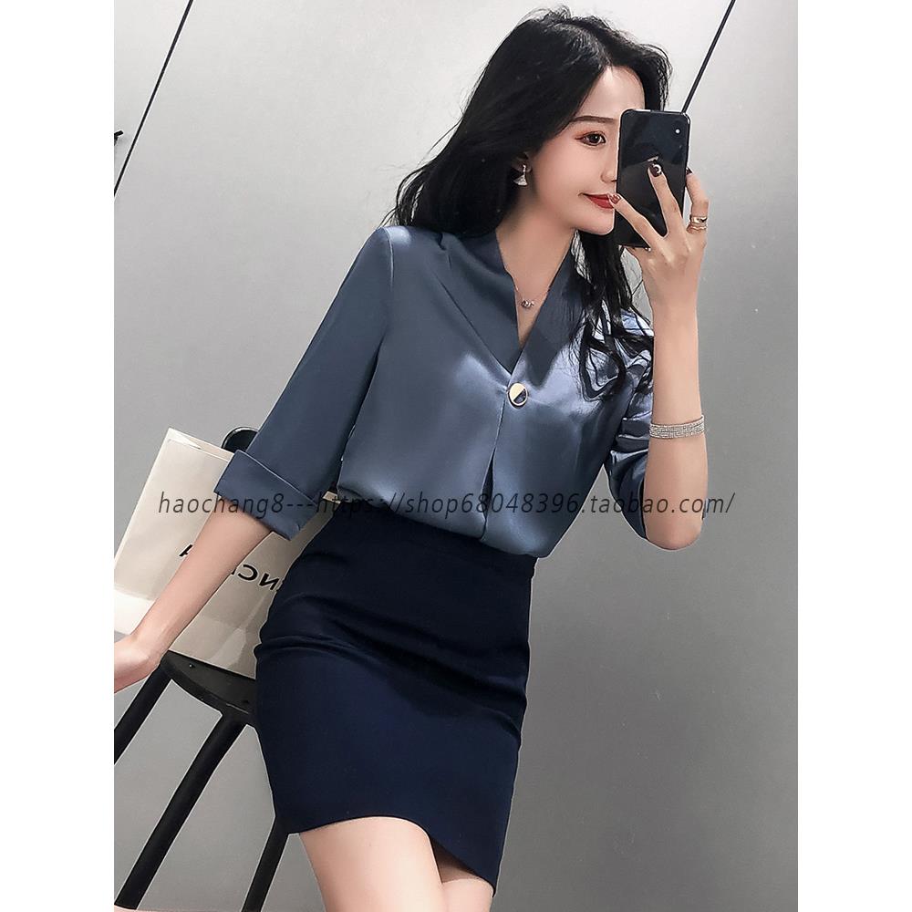 港风V领衬衫女春秋夏季中袖气质显瘦上衣时尚韩版百搭套装工作服