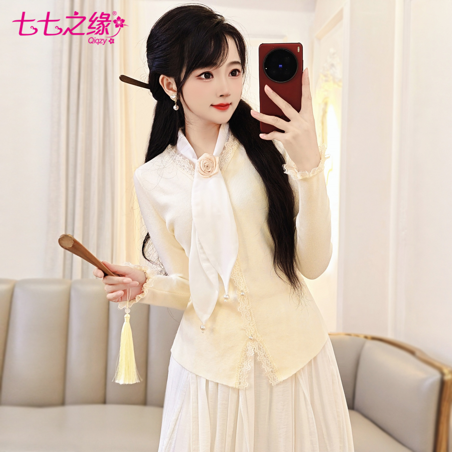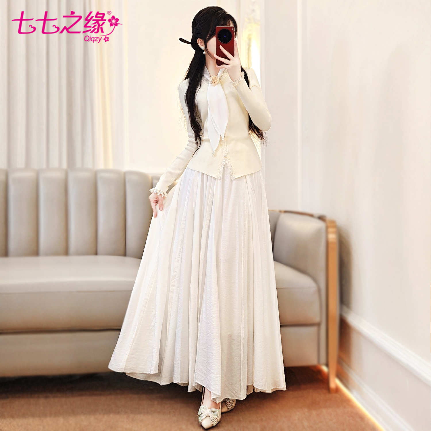 七七之缘2025秋冬装新款修身显瘦杏色针织上衣棉质半身长裙两件套