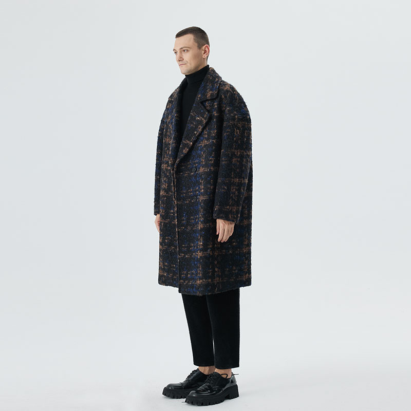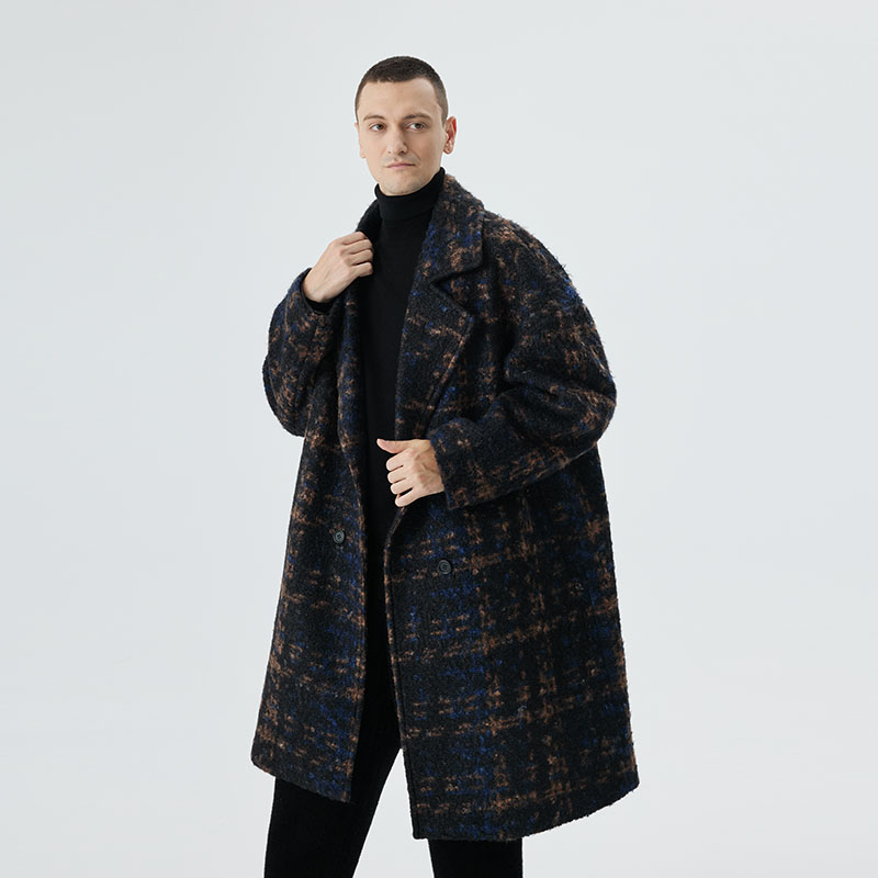 中长款仿羊毛呢子大衣男士冬季宽松双排扣中长款格子呢大衣外套潮