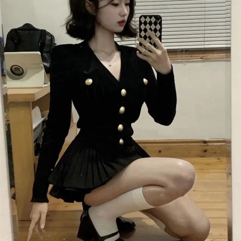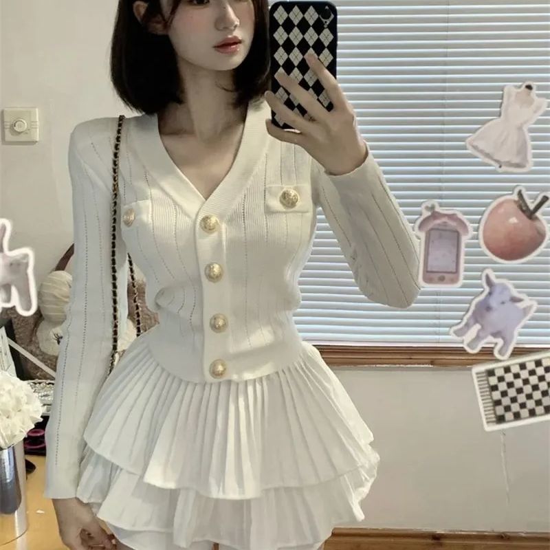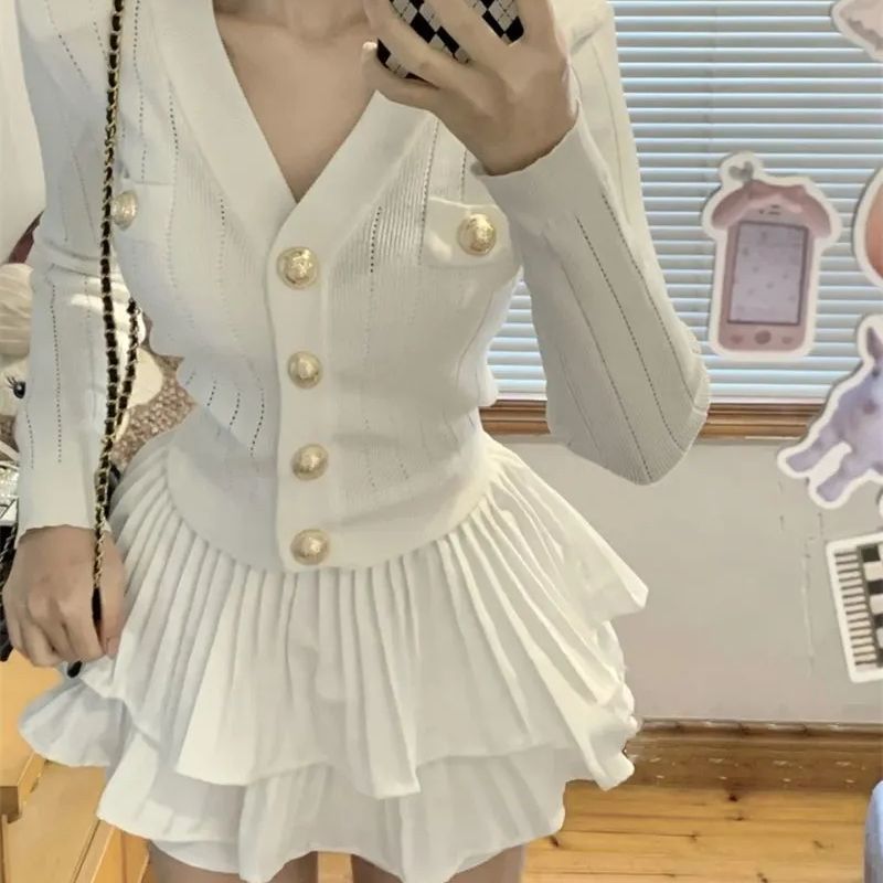 法式小香风针织连衣裙子女春秋2025新款富家千金高级感蓬蓬裙套装