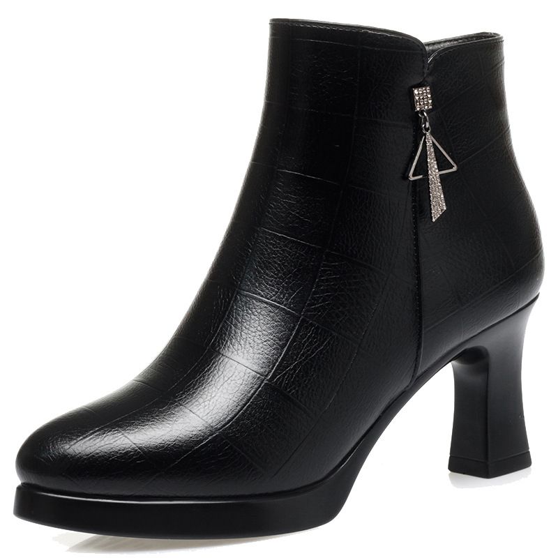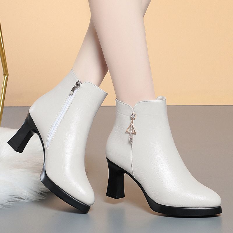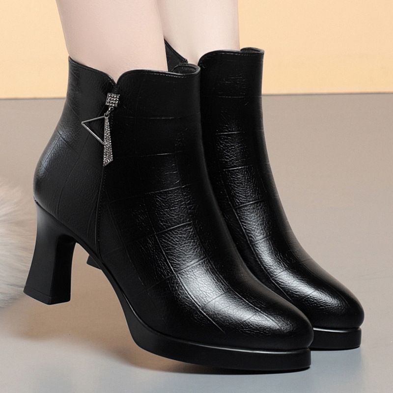 高跟短靴女2025新款时装靴子尖头秋冬季皮鞋加绒中年妈妈短筒女靴