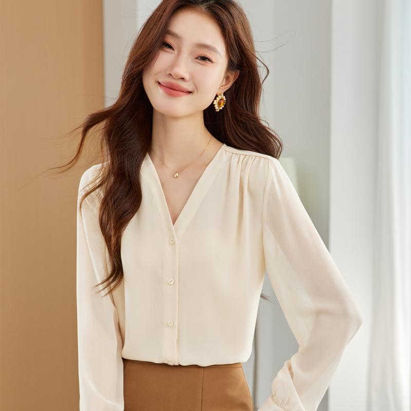V领压皱雪纺衫女上衣2025秋装新款OL宽松大码洋气小衫长袖女衬衣
