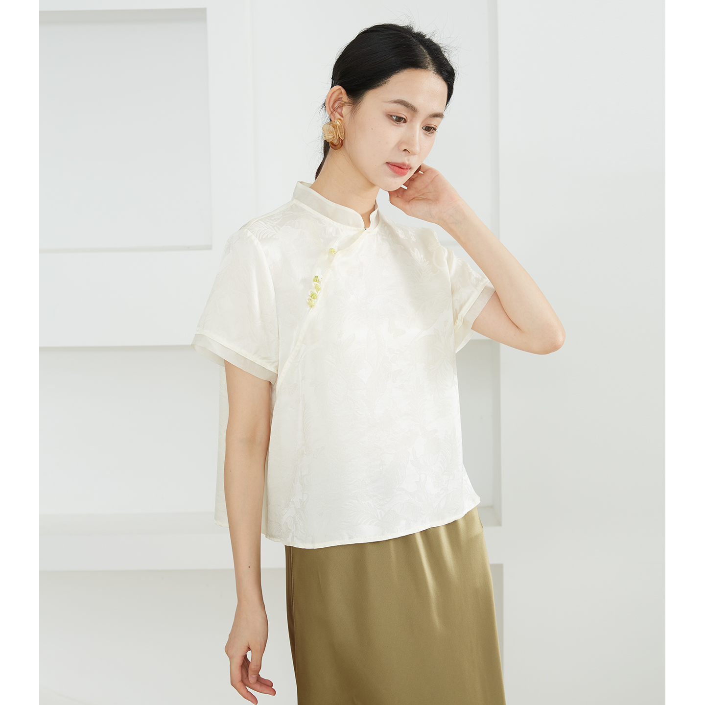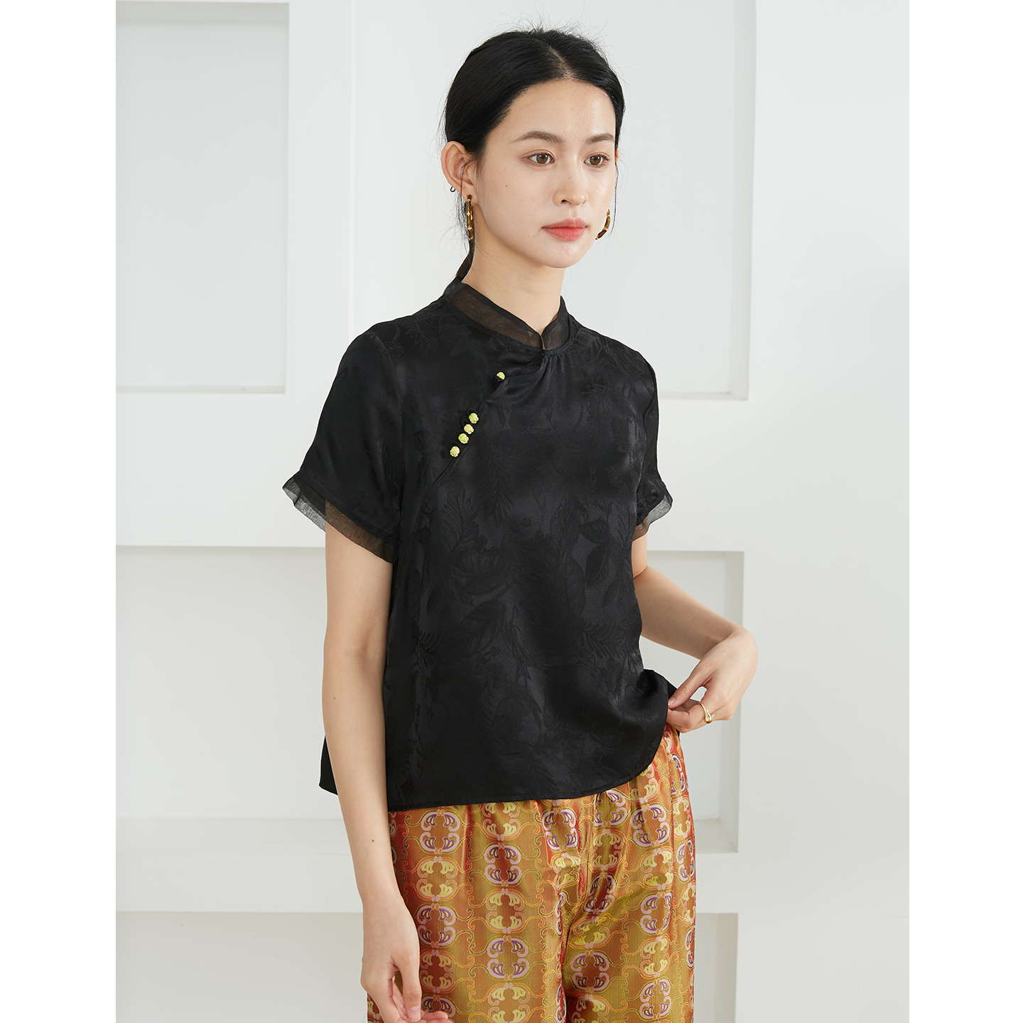现货 欧根纱拼接短袖国风提花真丝上衣女100%桑蚕丝立领斜襟小衫