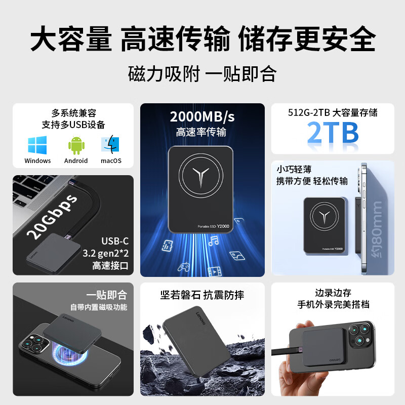 联想手机磁吸移动固态硬盘1t高速适用苹果15/16Promax边录边存2tb