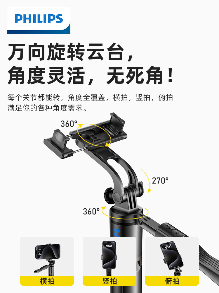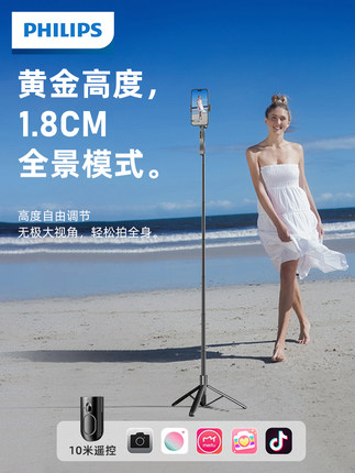 飞利浦2023新款金属多功能补光自拍杆三脚架遥控拍照神器手机直播支架360°旋转拍照抖音蓝牙便携式防抖