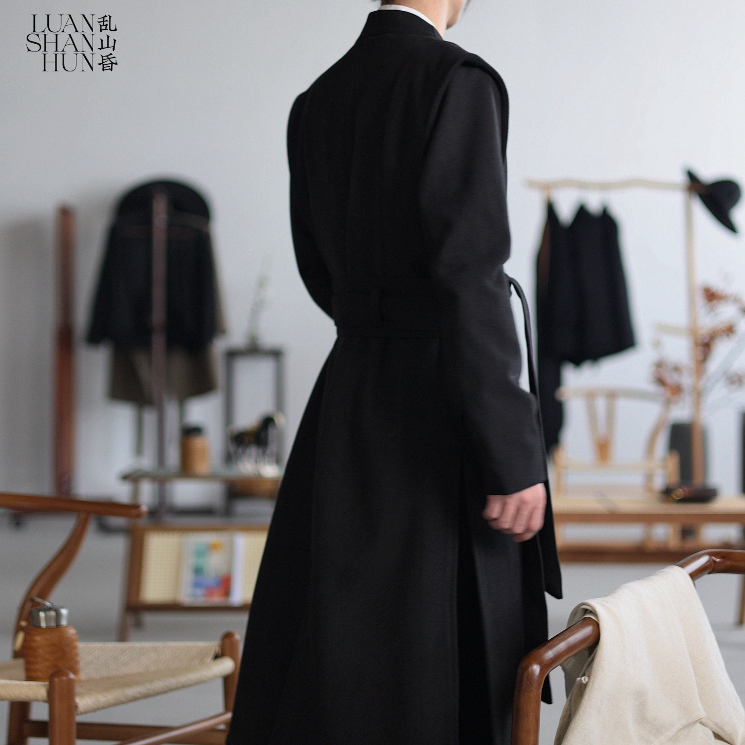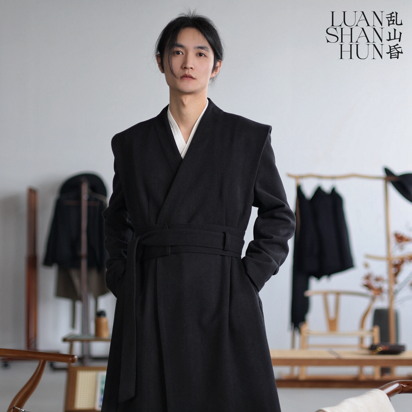 乱山昏「侠」新中式国风原创长款人字纹呢大衣外套飞袖黑棕色秋冬