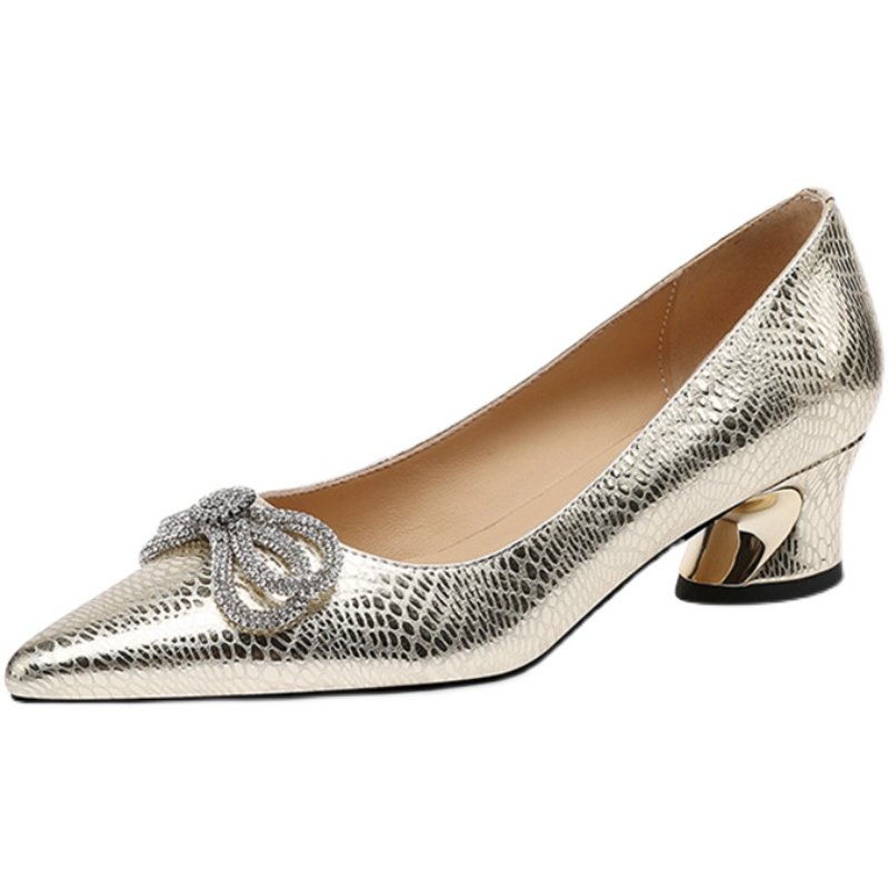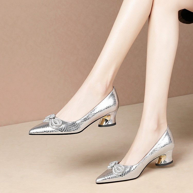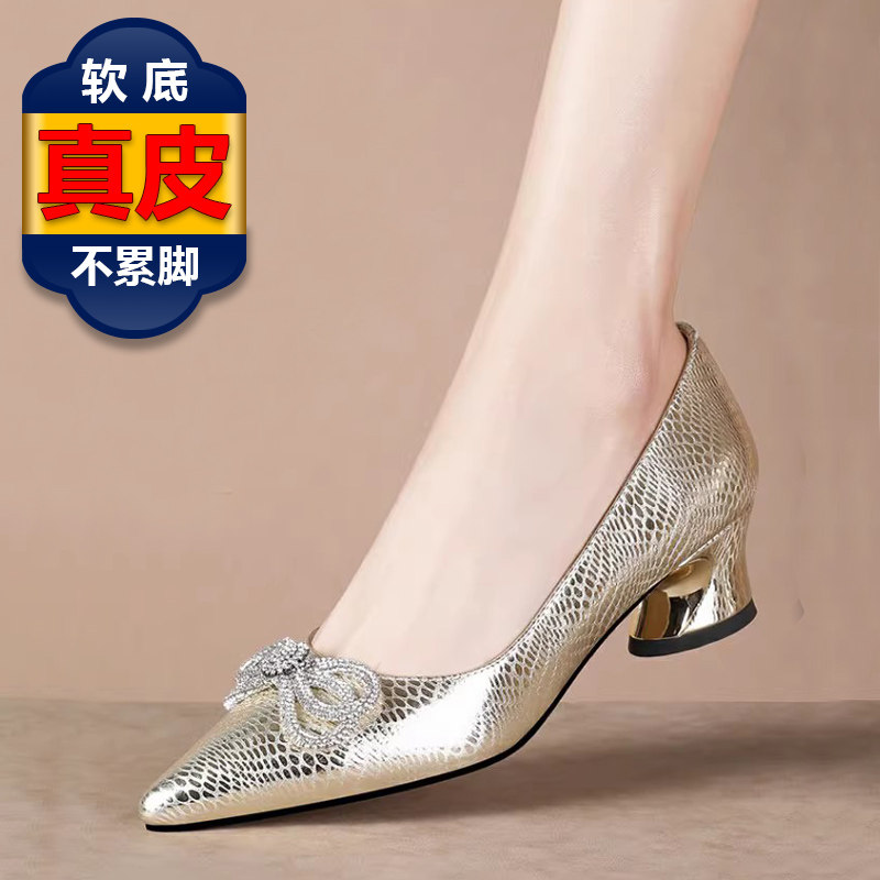 舒适柔软舒适职业中跟单鞋2025新款粗跟真皮女鞋水钻蝴蝶结高跟鞋