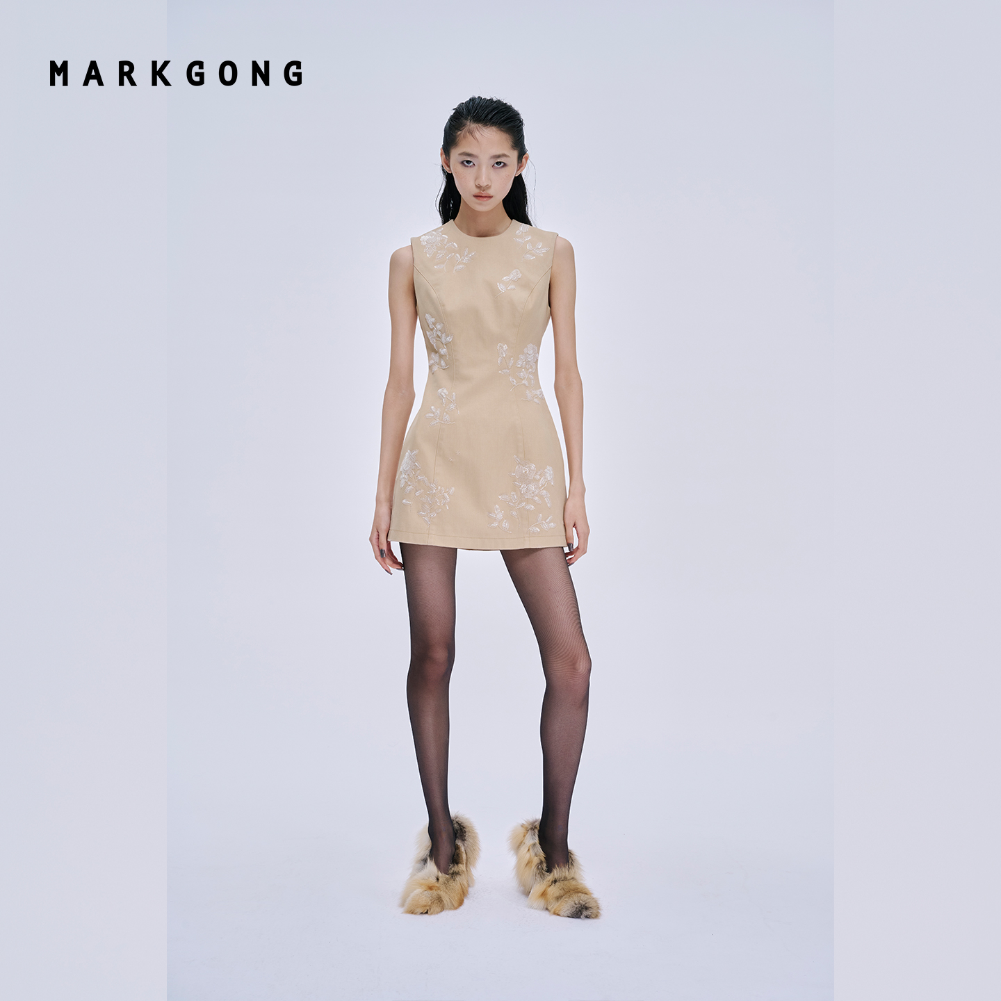 【MARKGONG】潮流精品军绿修身钉珠连衣裙2025秋季新品女装裙子