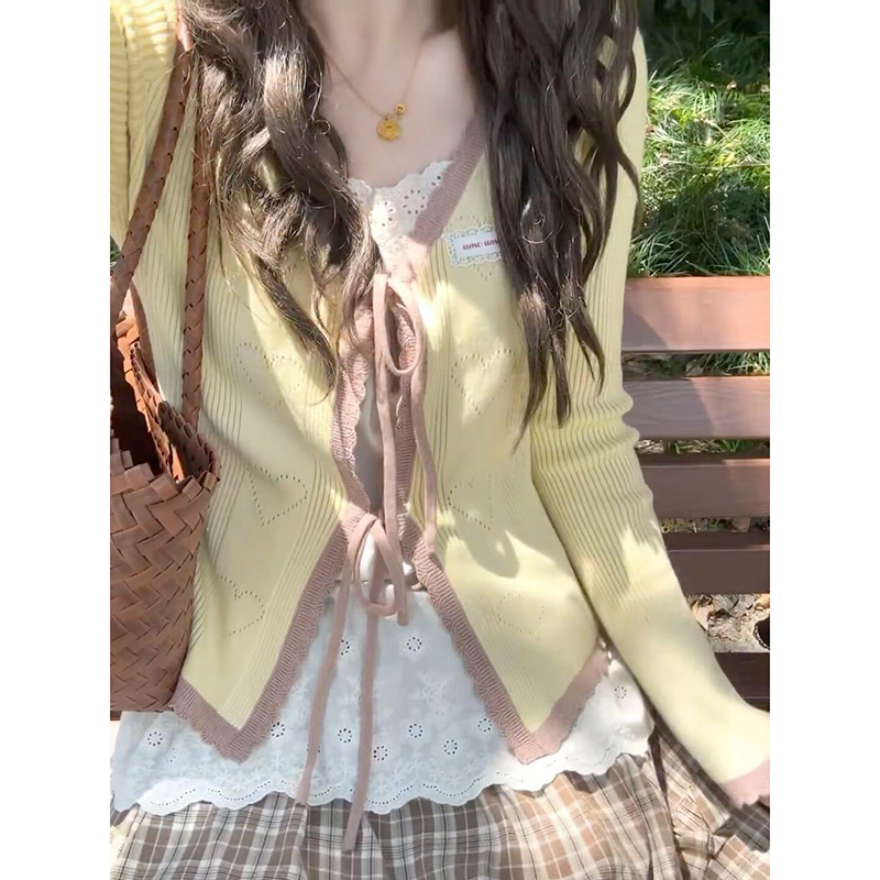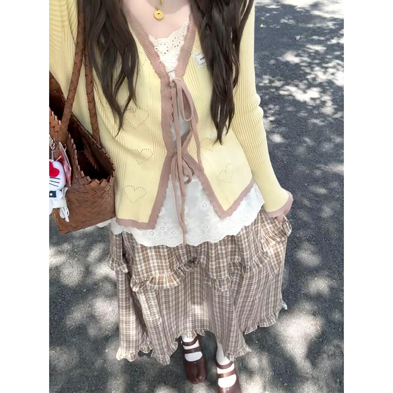 日系清纯校园少女风黄色系带针织开衫搭配格纹高腰半身裙两件套装