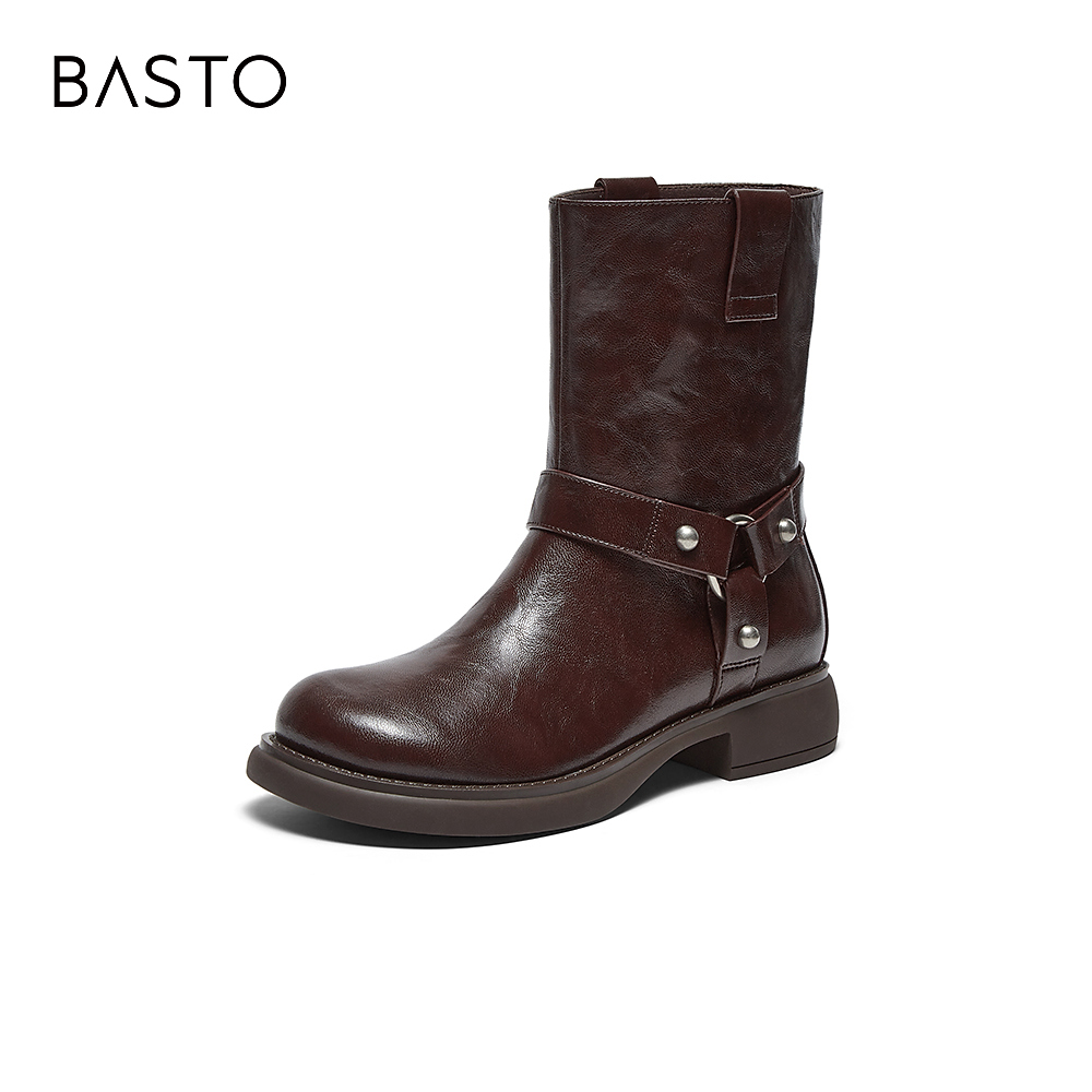 百思图冬季新款时尚通勤真皮法式短靴圆头粗跟女马丁靴A3383DZ4