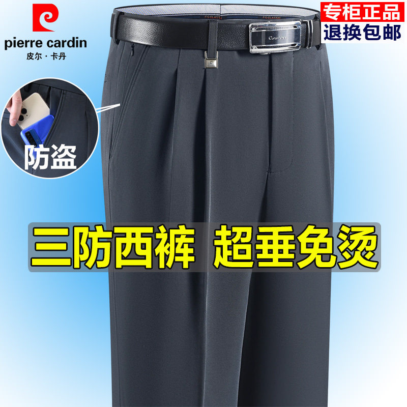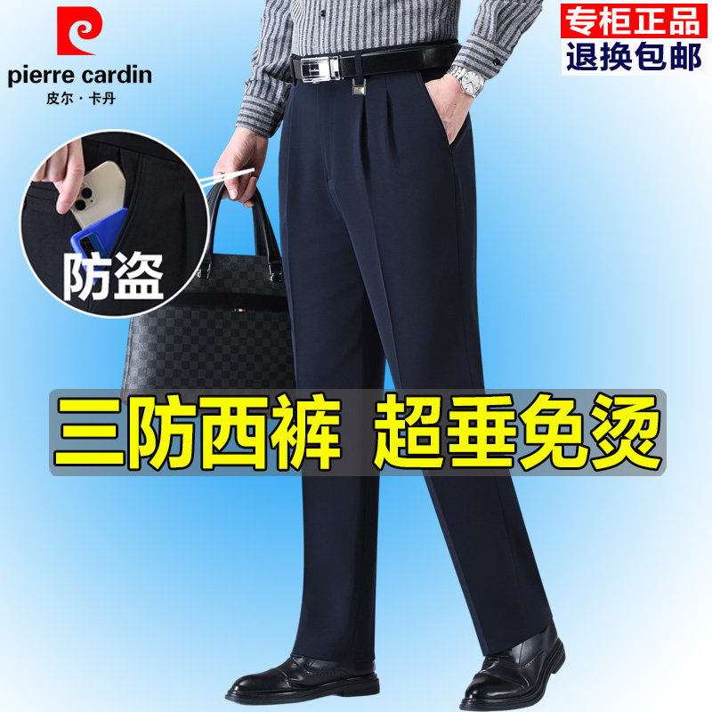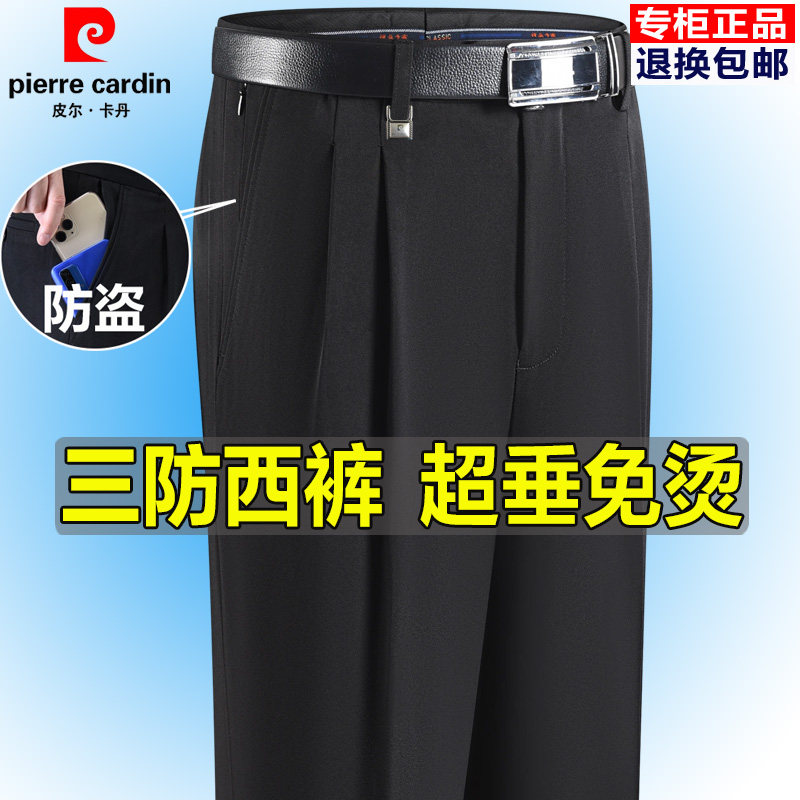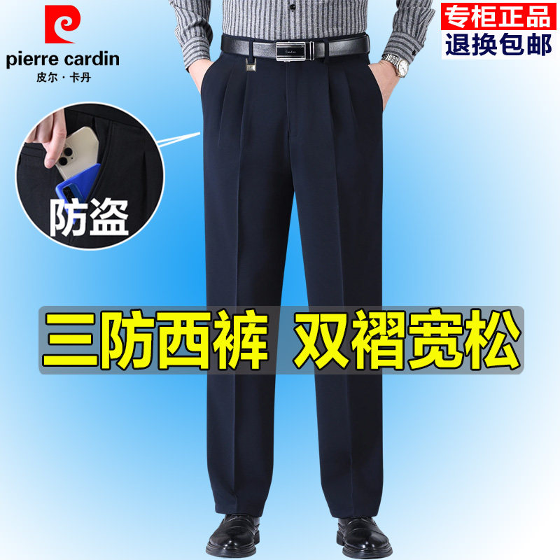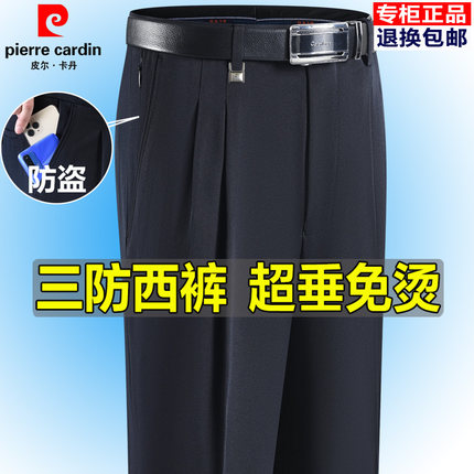 皮尔卡丹三防西裤男双褶宽松秋冬厚款中老年高腰免烫毛蚕丝西装裤