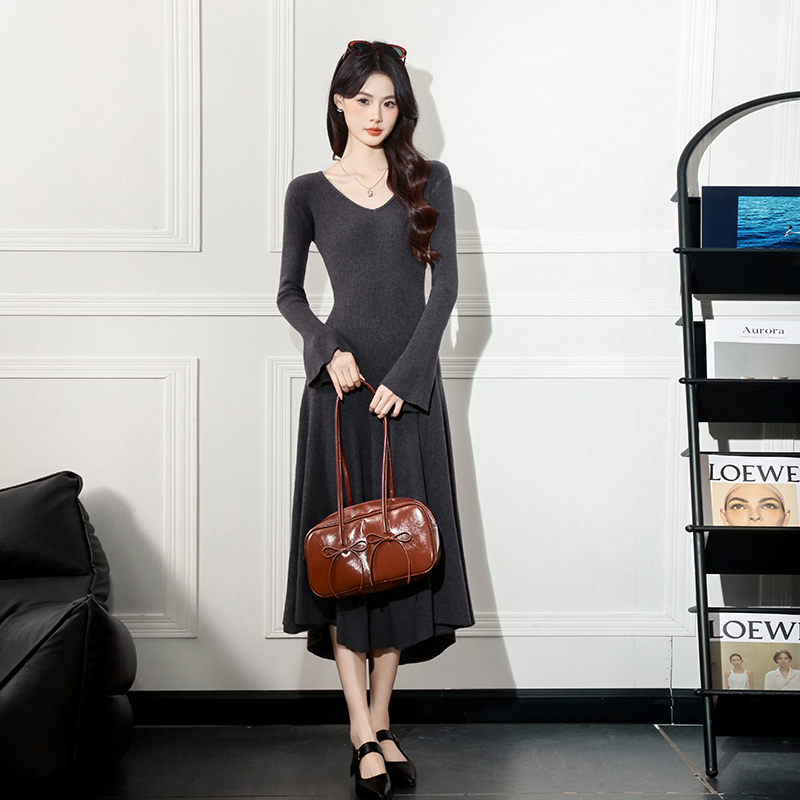 2025秋冬新款V领喇叭袖优雅气质修身显瘦针织毛衣百搭连衣裙