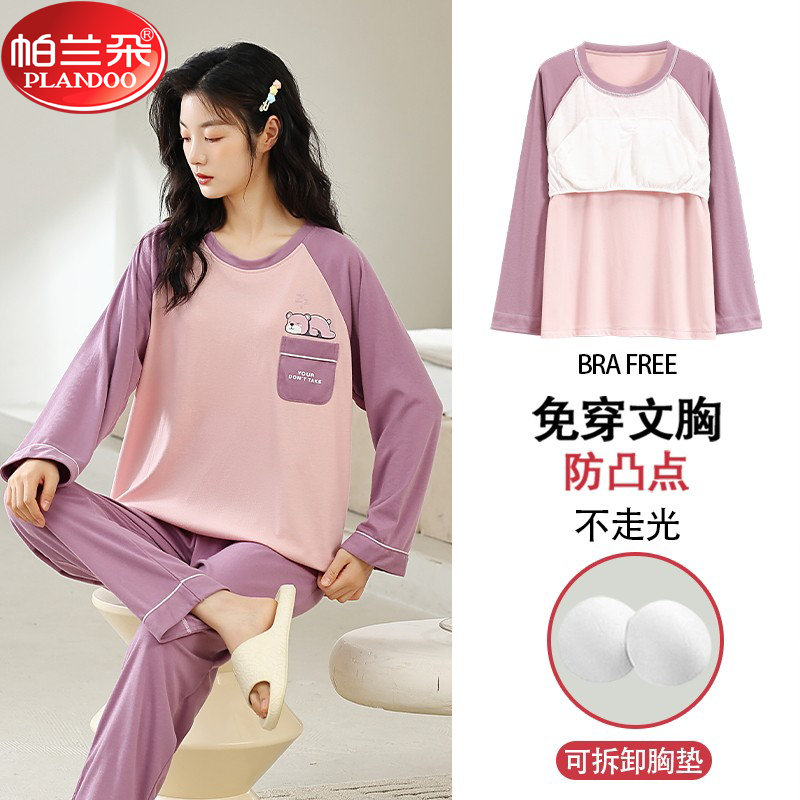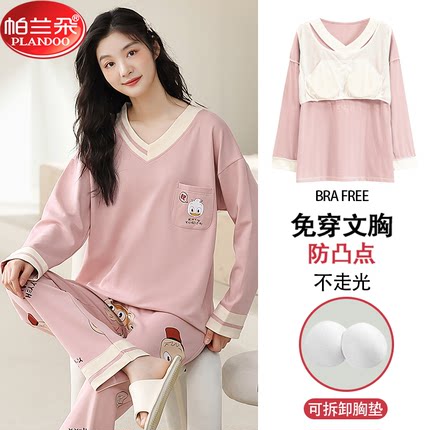帕兰朵带胸垫睡衣女春秋款纯棉长袖长裤套装大码宽松可外穿家居服