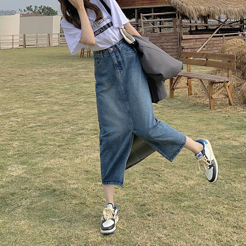 高腰开叉牛仔半身裙女2023大码胖mm新款春秋中长款遮胯a字包臀裙