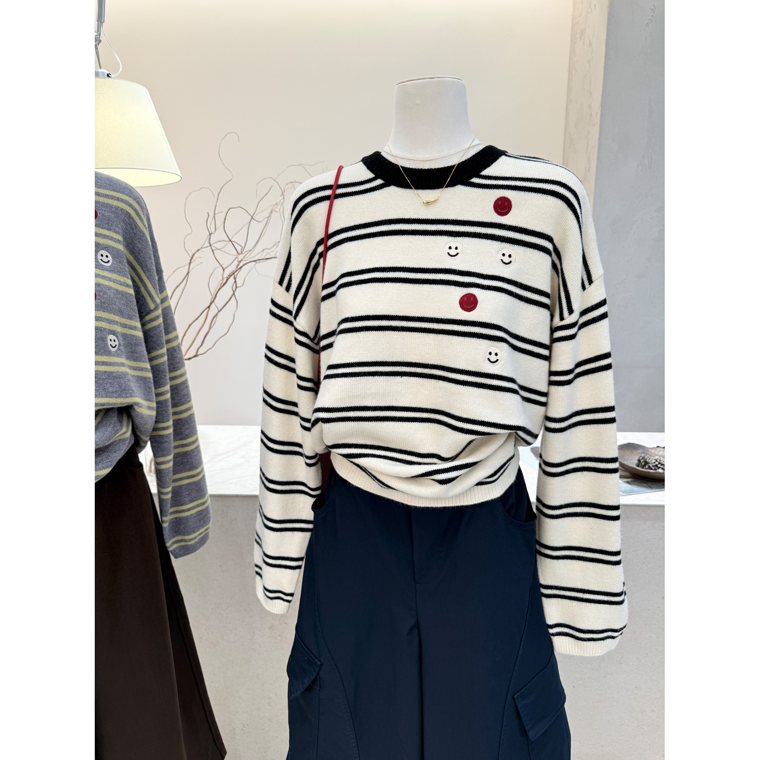 小哲 韩版刺绣笑脸条纹针织毛衣女秋季新款宽松长袖针织衫上衣