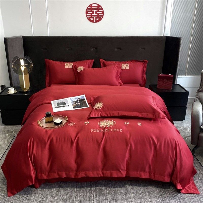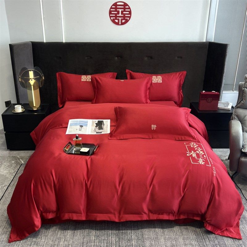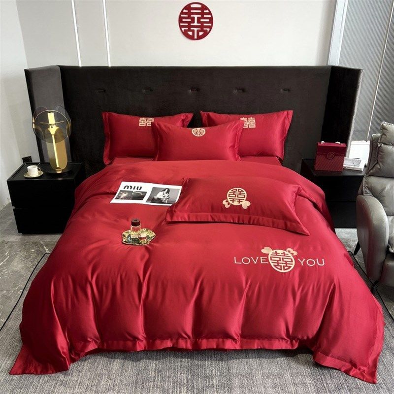 大红色水洗棉磨毛结婚床上四件套新婚庆床品床单婚礼嫁喜被套床笠
