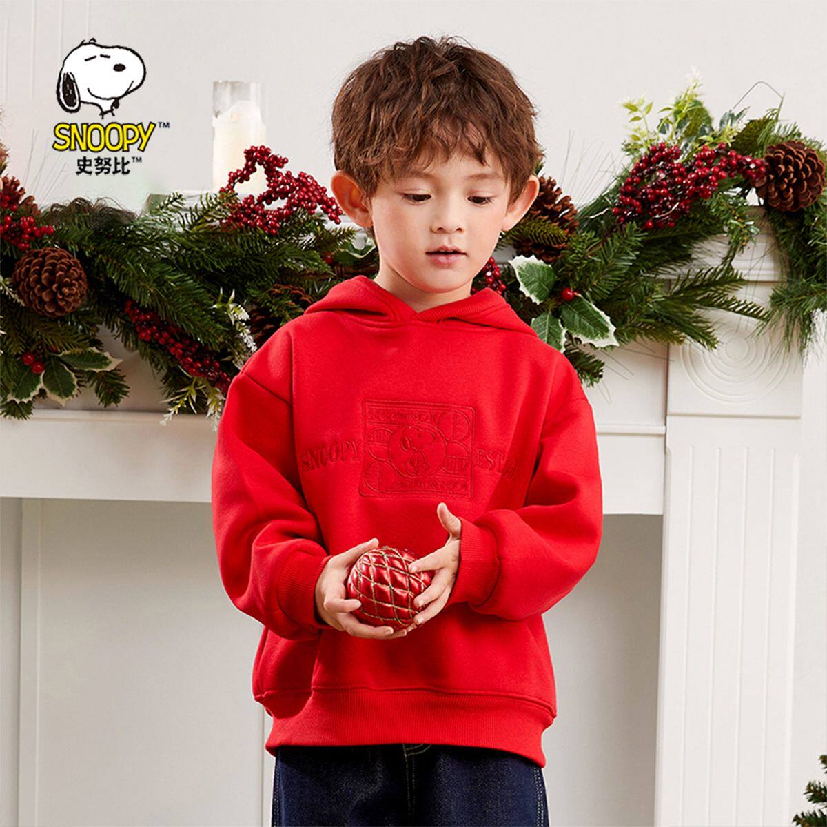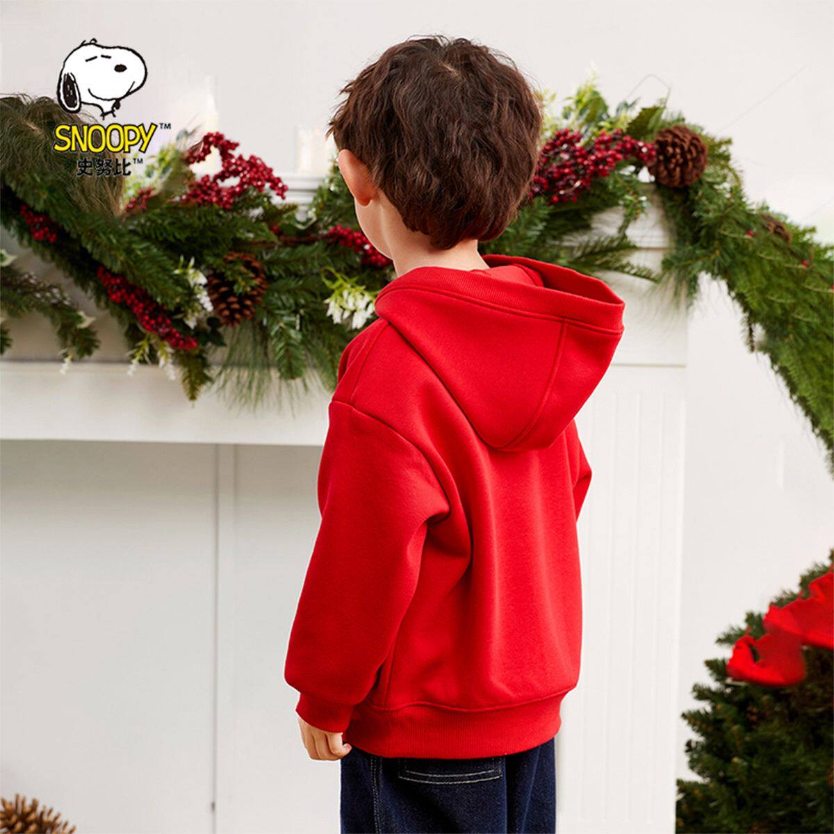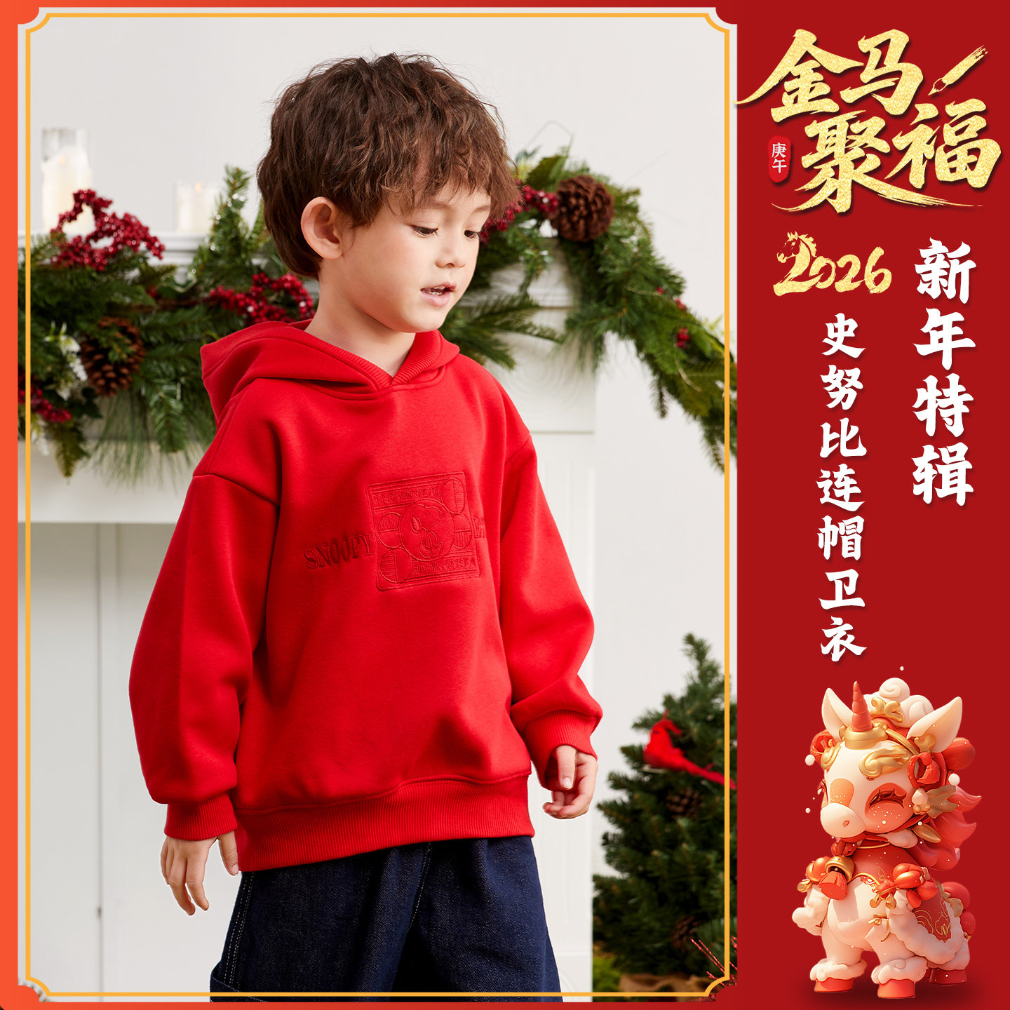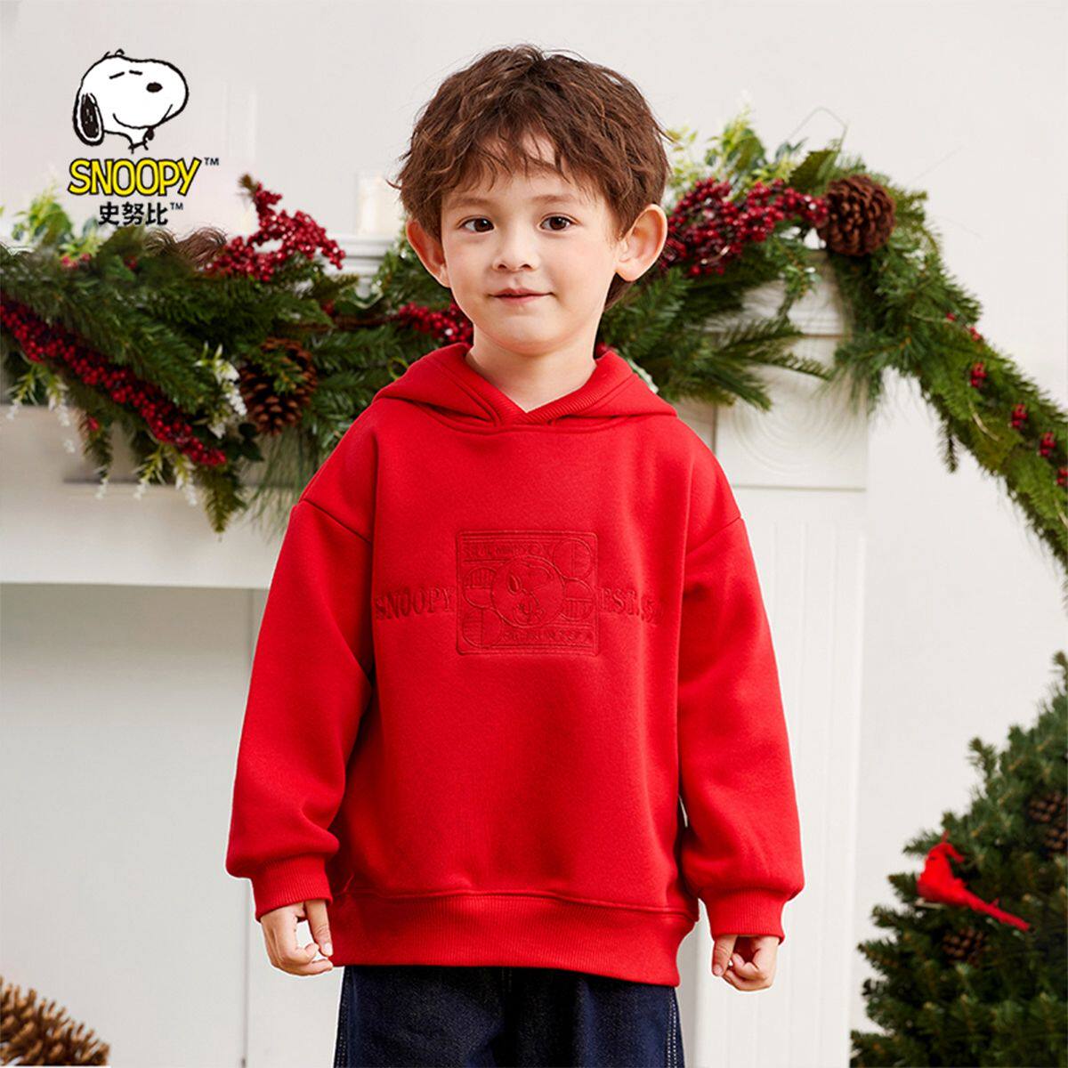 史努比童装加绒卫衣红色马年拜年服新年男女童儿童连帽卫衣内搭
