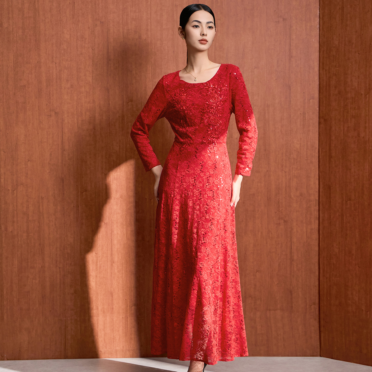 马天奴女装春秋新款红色蕾丝绣花连衣裙收腰气质高级长裙洋气礼裙
