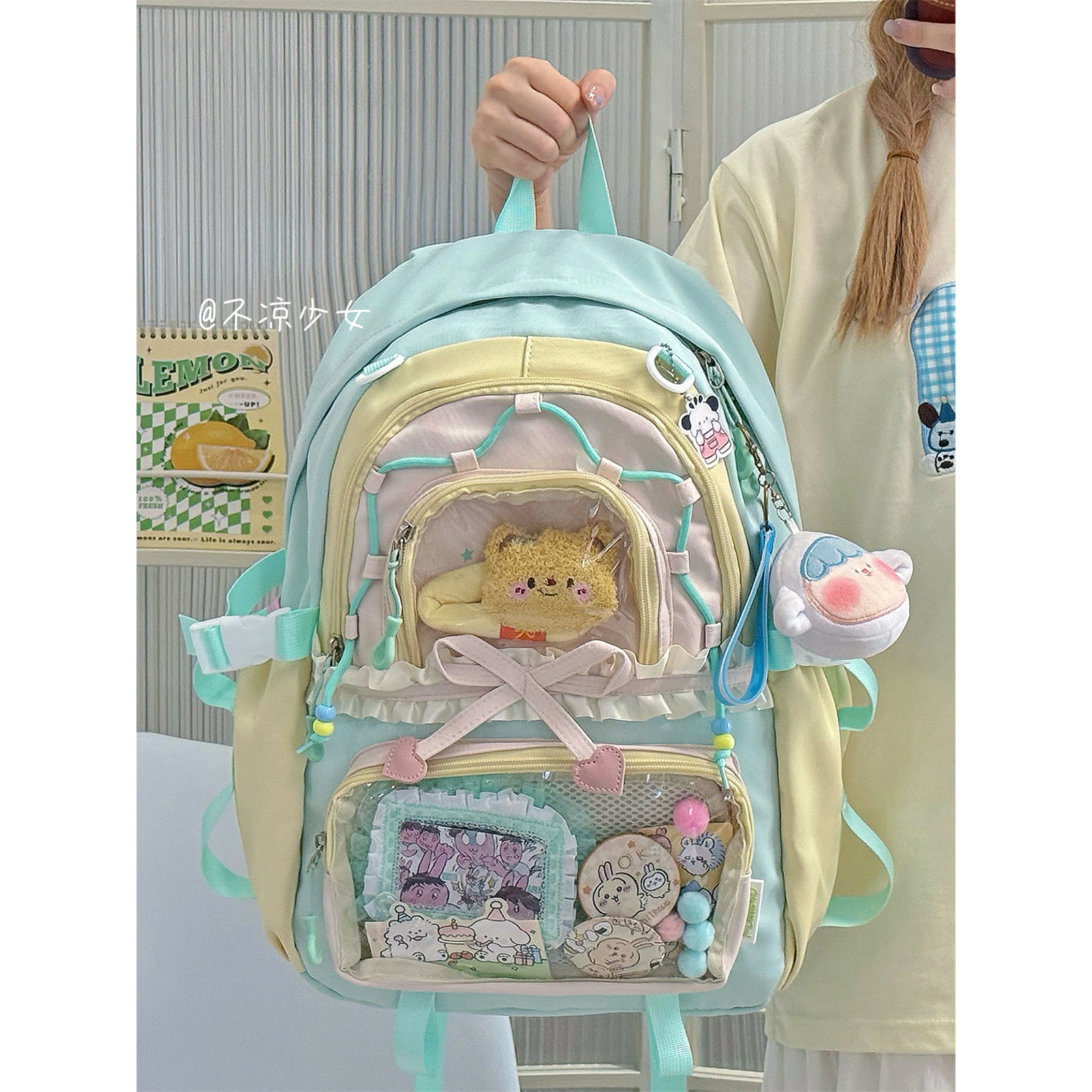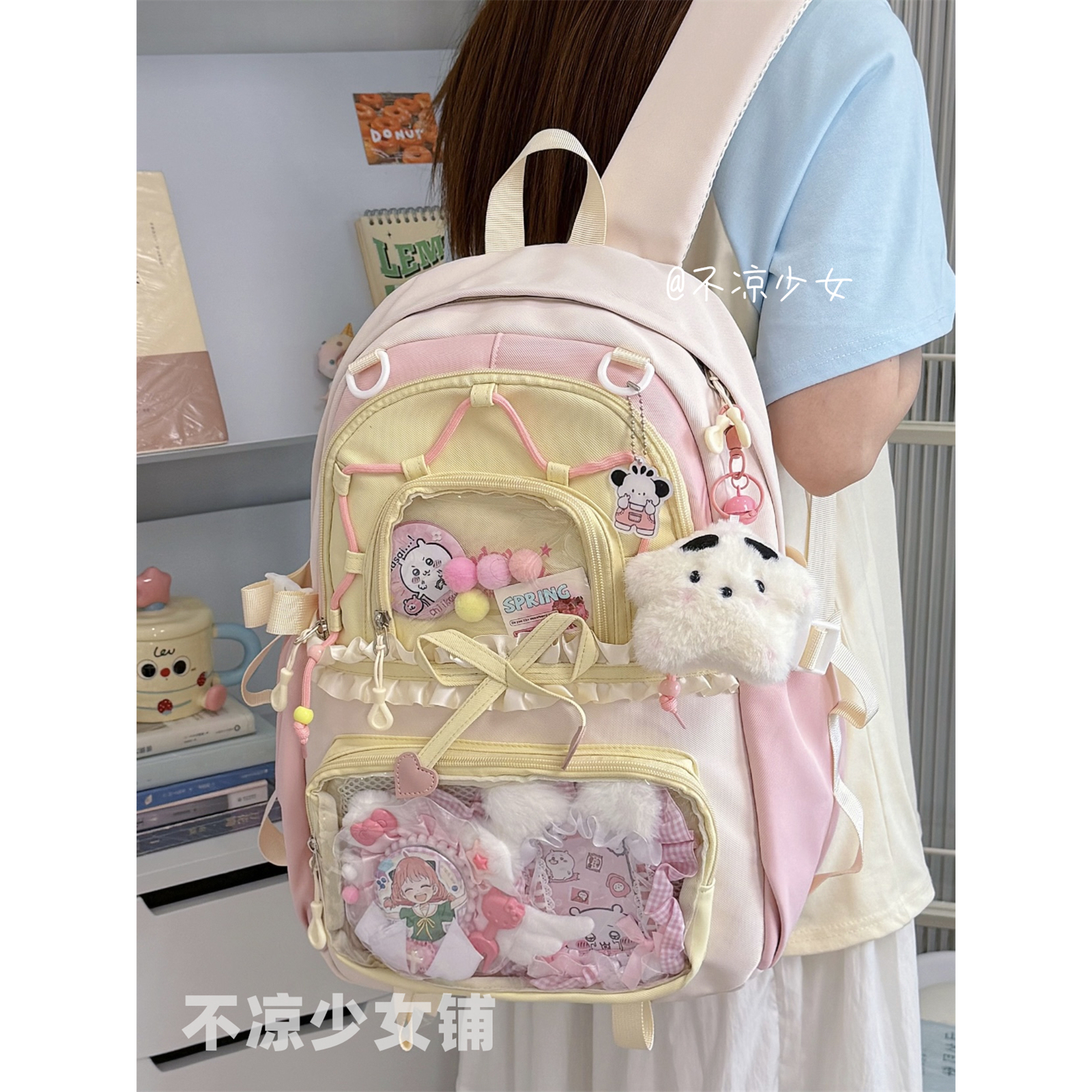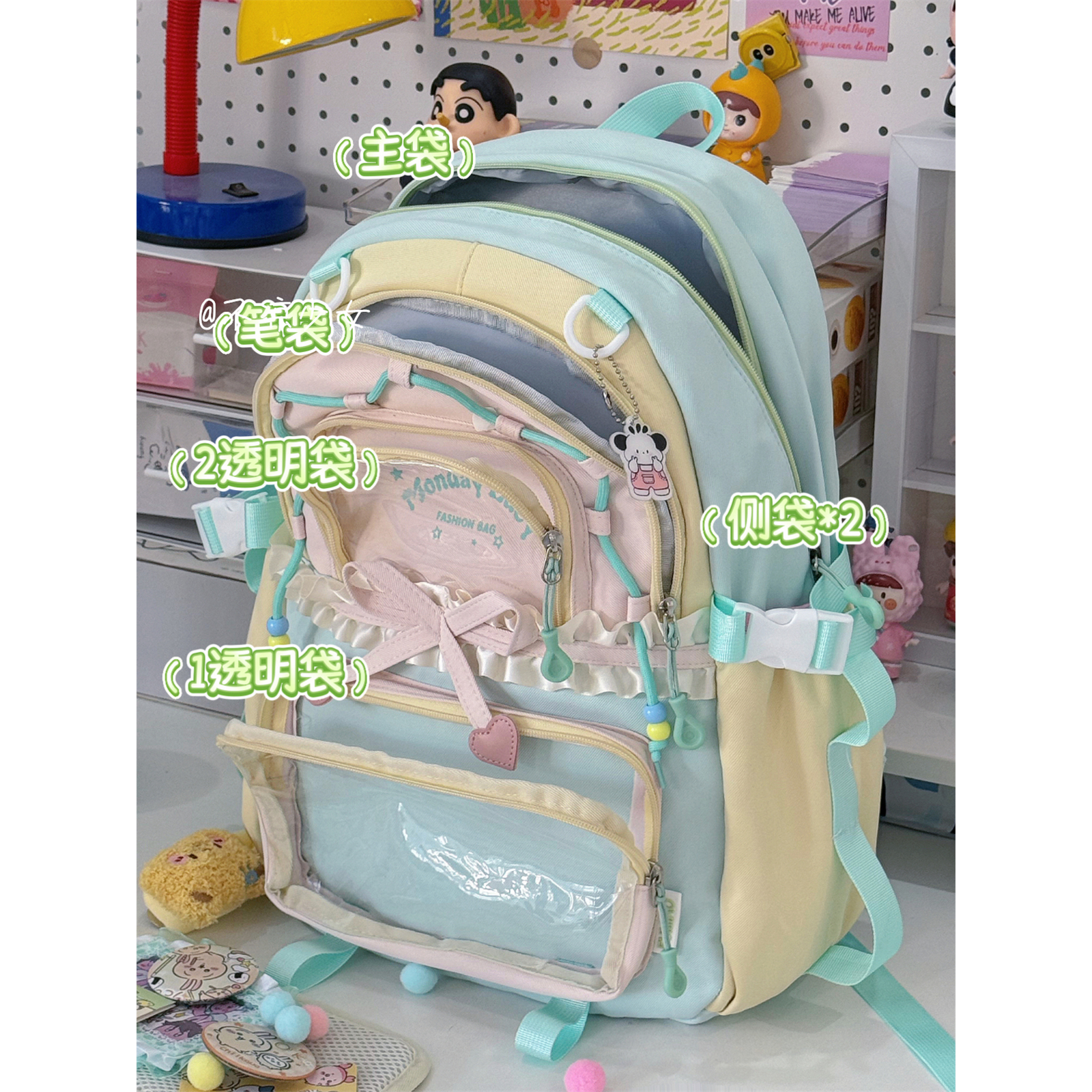 多巴胺撞色初中生书包高中学生大容量双肩背包蝴蝶结花边痛包娃包