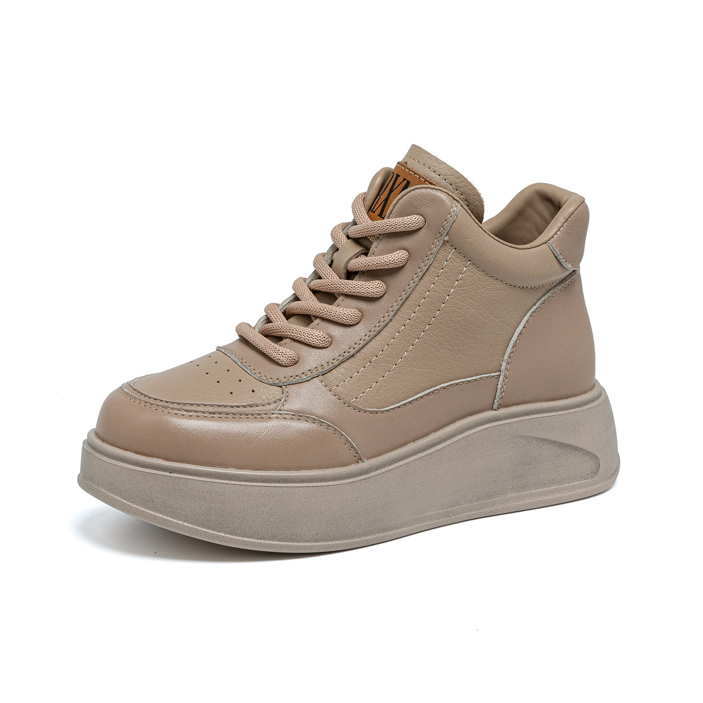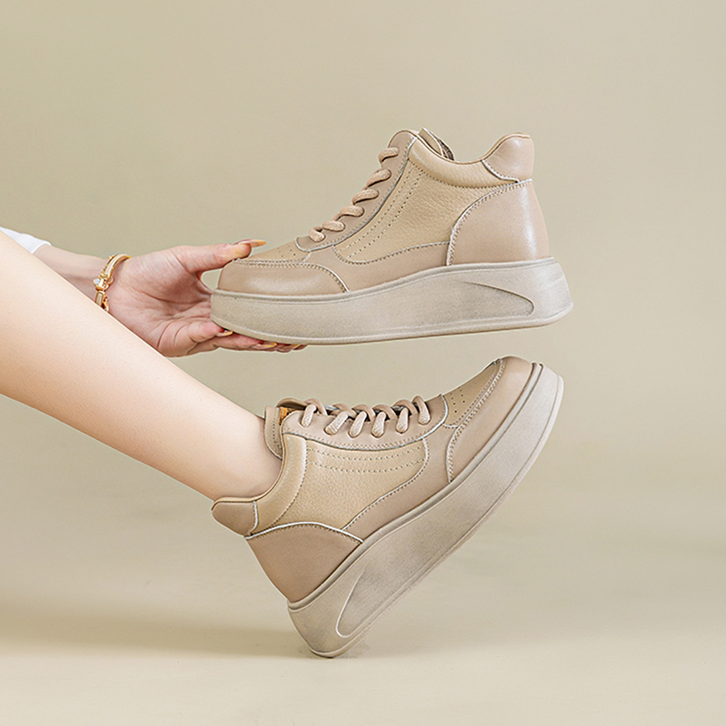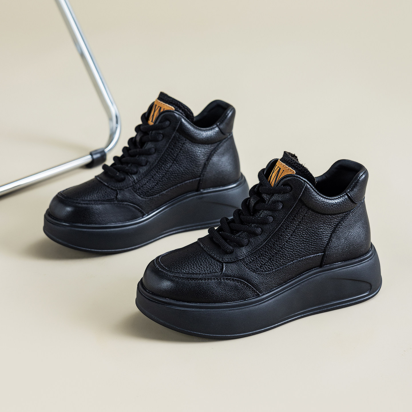 头层牛皮黑色高帮鞋女春秋单鞋厚底增高休闲运动板鞋百搭松糕鞋子