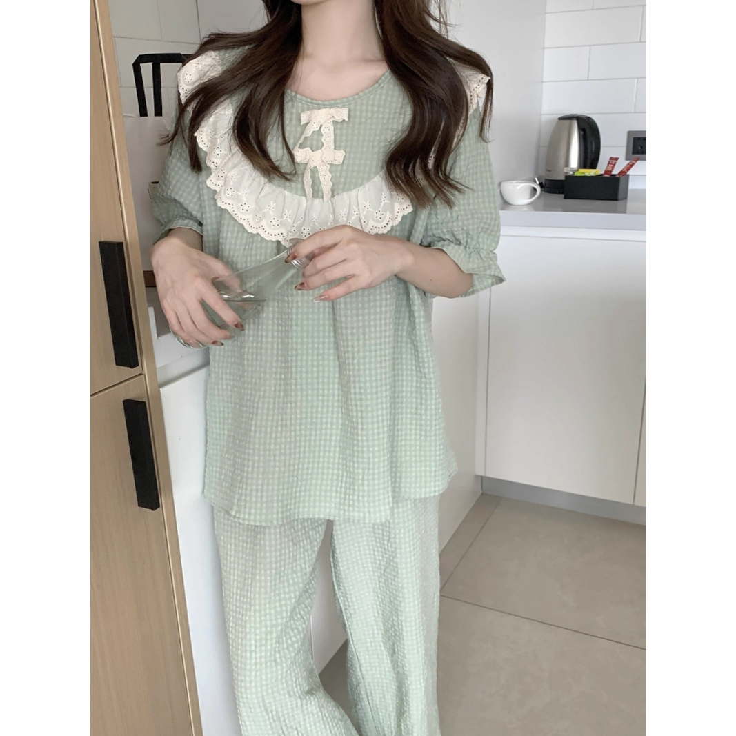 睡衣女款夏短袖长裤韩版甜美宫廷风蕾丝格子纯棉麻家居服套装情侣