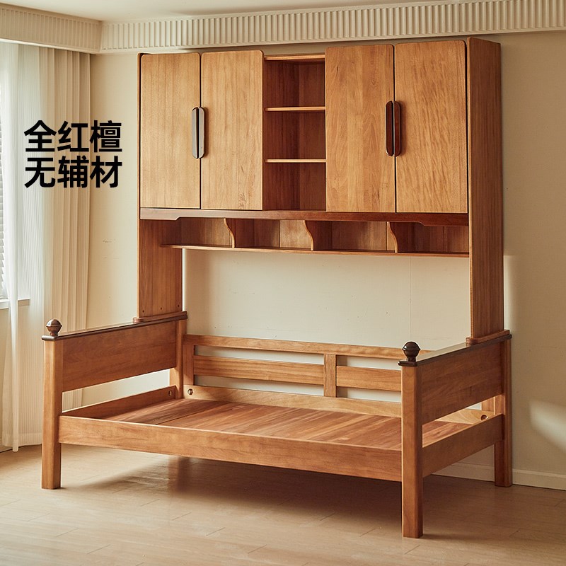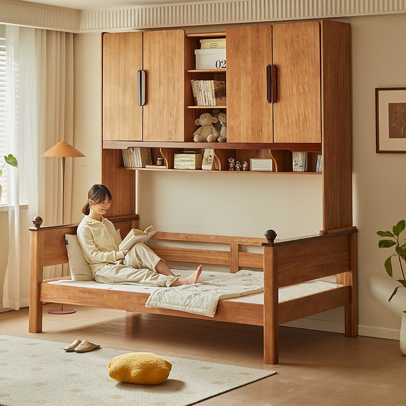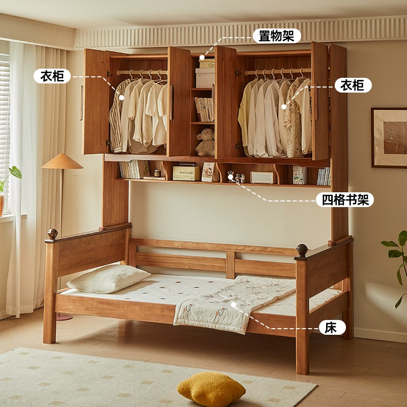 金多喜实木儿童床衣柜一体中古风小户型单人床新中式功能组合单床