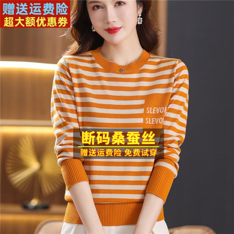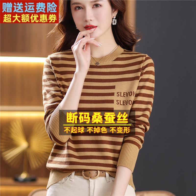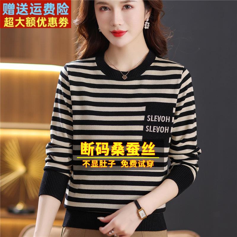 春秋新款秋装桑蚕丝长袖t恤大码条纹针织打底漂亮内搭上衣小衫女