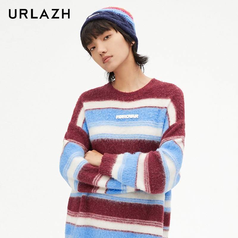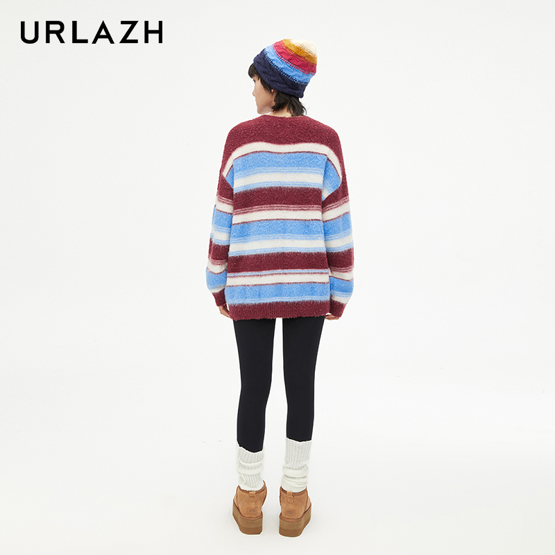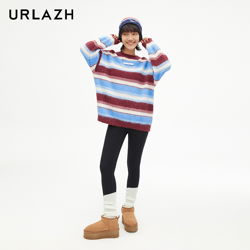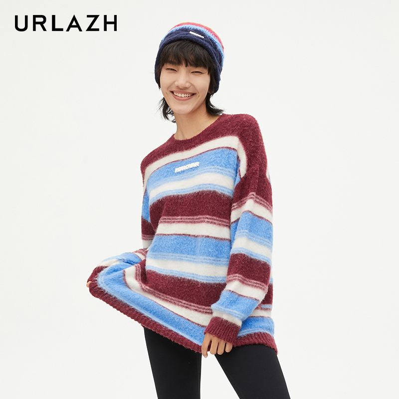 URLAZH有兰新款休闲简约百搭慵懒撞色条纹宽松圆领长袖针织毛衣女