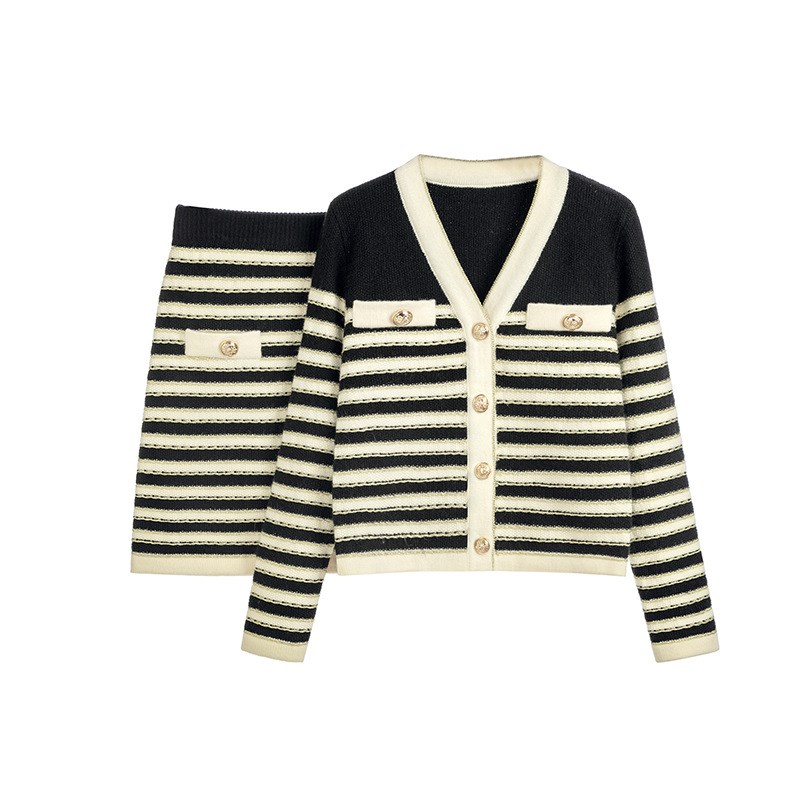 新款针织冬季套装休闲两件套条纹撞色高腰A字短裙开衫V领女装外套