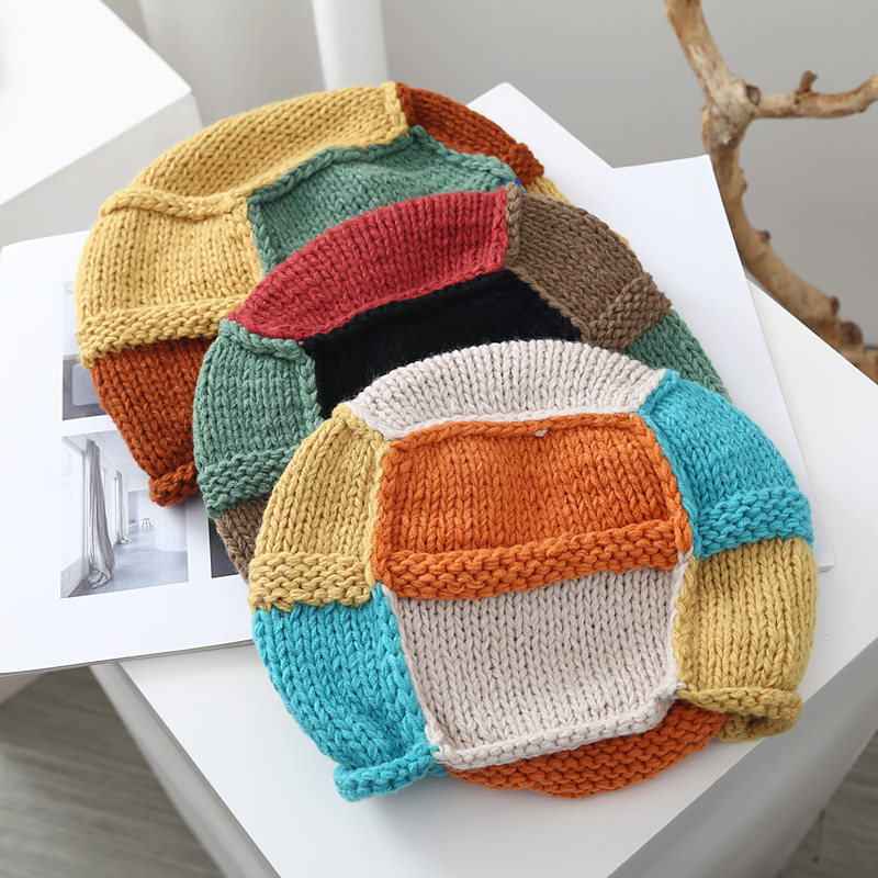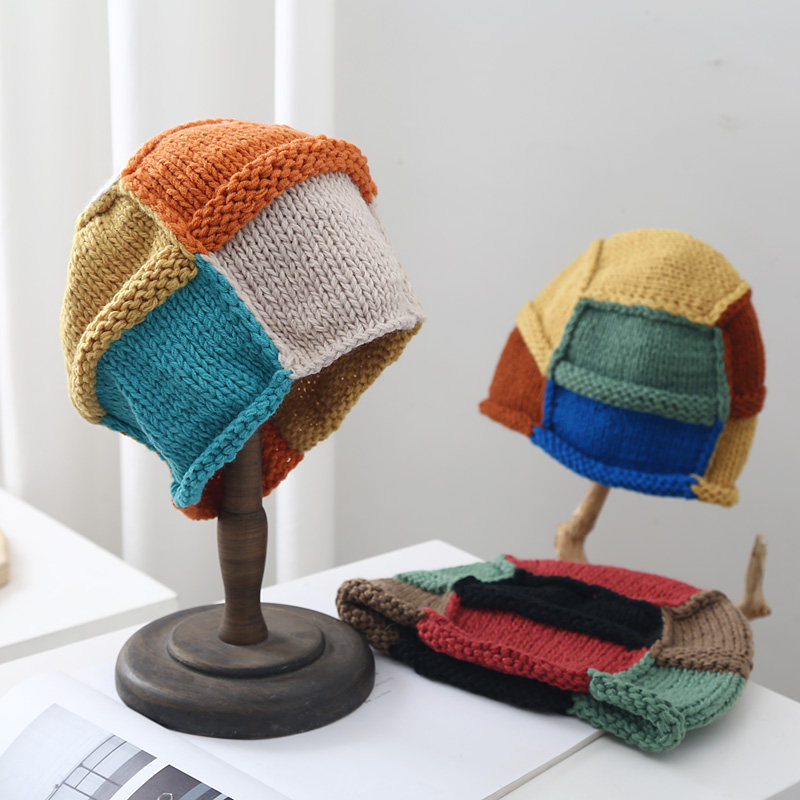 日系可爱撞色拼接手工针织渔夫帽女秋冬天百搭保暖毛线套头贝雷帽