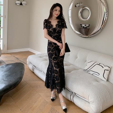 明星同款女装新款经典黑色性感V领蕾丝连衣裙高级感好看鱼尾长裙